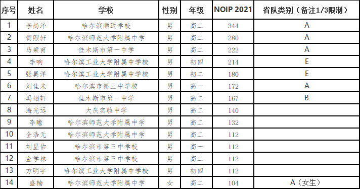 根据《CCF关于NOI2022省内选拔的若干规定》,及《CCF NOI2022黑龙江省省队选拔方案》第8条规定,黑龙江省省队A、B、E类名额将依据2021年NOIP成绩确定省队人选。NOIP2021于2021年11月20日在各省举行,成绩已公布。根据《CCF NOI2022名额分配方案》,黑龙江省队A、B类名额共6人(A队由4名男生和1名女生组成)。