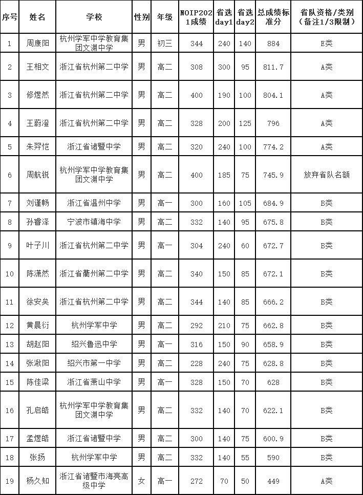 浙江省队A、B类名额共17人(16名男生,1名女生),E类名额1人;前18位考生中有一名考生申请放弃进入省队并经所在学校同意,按顺位增补一位考生为省队队员。依据CCF规定,现对省队入选名单公示如下: