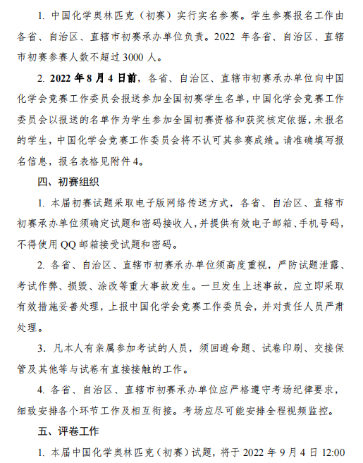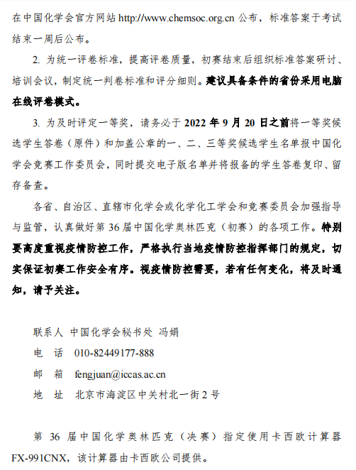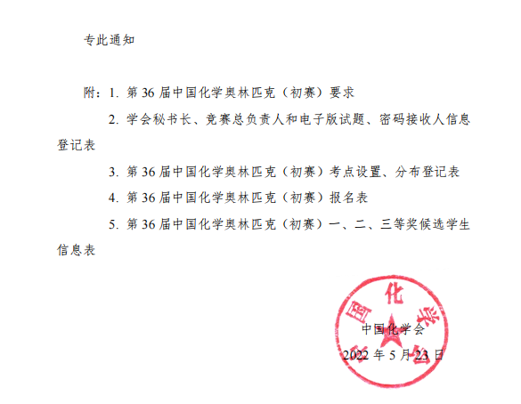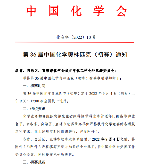 2022年第36届中国化学奥林匹克(初赛)通知已经正式发布,初赛定于2022年9月4日(周日)9:00~12:00 在全国统一进行。