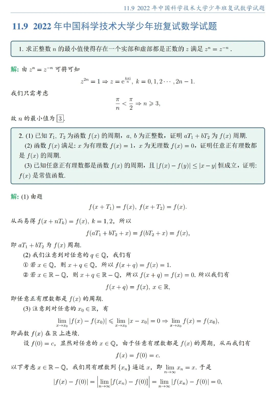 2022年中国科学技术大学少年班复试数学试题解析