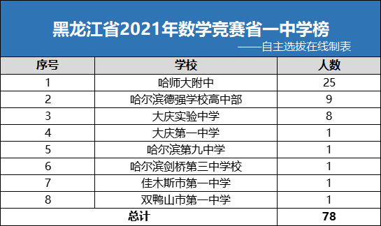 根据2021年黑龙江数学竞赛省一获奖情况来看,黑龙江省共有78人获得省一奖项,共有8所学校在列,其中,哈师大附中占有25个席位,断崖式领先。其次,哈尔滨德强学校高中部有9名同学获此殊荣,大庆实验中学8名同学获奖,其余5所中学各有1名同学获奖。