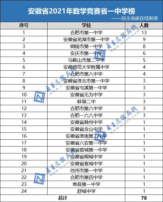 目前学科竞赛越来越受到重视,在特殊类招生中竞赛奖项以及竞赛经历都会受到高校的青睐,为帮助大家了解安徽省数学竞赛省一获奖情况,自主选拔在线团队整理了2021年安徽省数学竞赛省一中学排名,供大家参考!