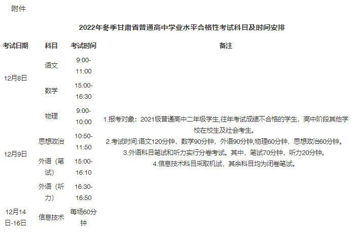 附件:2022年冬季甘肃省普通高中学业水平合格性考试科目及时间安排