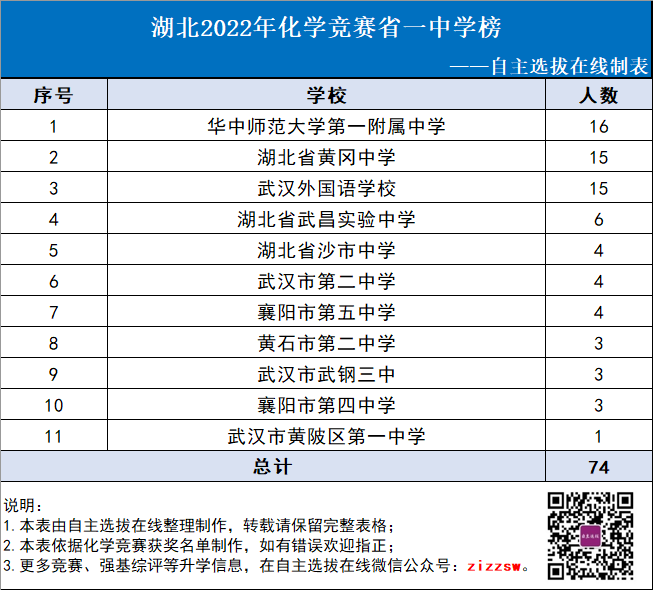 根据2022年湖北省化学竞赛省一获奖情况来看,共有74名考生荣获省一,共有11所学校在列,其中华中师范大学第一附属中学有16名同学获奖,位居第一位,湖北省黄冈中学、武汉外国语学校紧随其后,均有15名同学获奖,从湖北省2022年化学竞赛省一情况来看,整体竞赛实力较均衡,各中学获奖人数较分散。