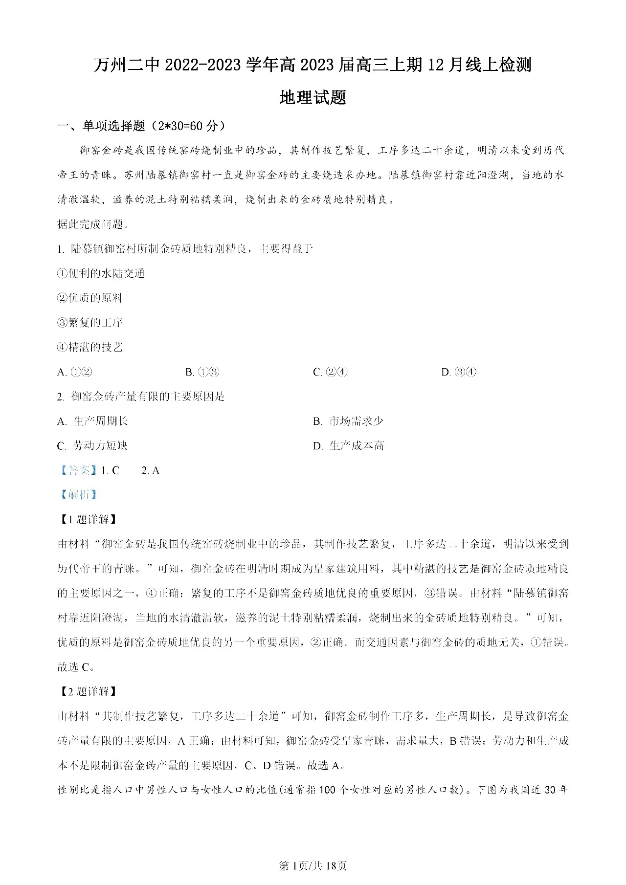 立即下载:2023重庆万州二中高三12月线上考试地理试题答案