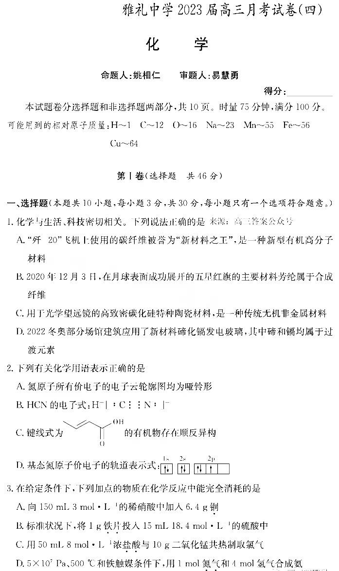 雅礼中学2023届高三月考于近日开考,为方便大家下载学习,自主选拔在线团队特整理了 雅礼中学2023届高三月考化学试题,供大家参考!