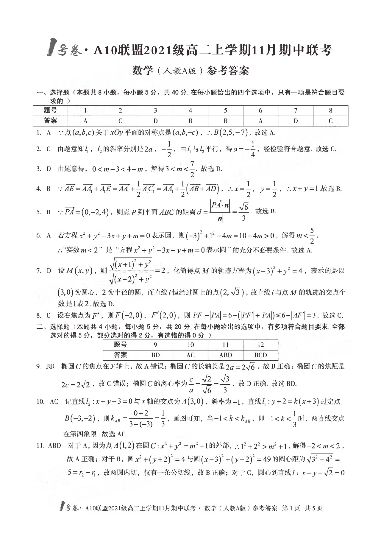2023安徽A10联盟高二11月联考于2022年11月17日开考,为方便大家下载学习,自主选拔在线团队特整理了2023安徽A10联盟高二11月联考数学试题答案,供大家参考!