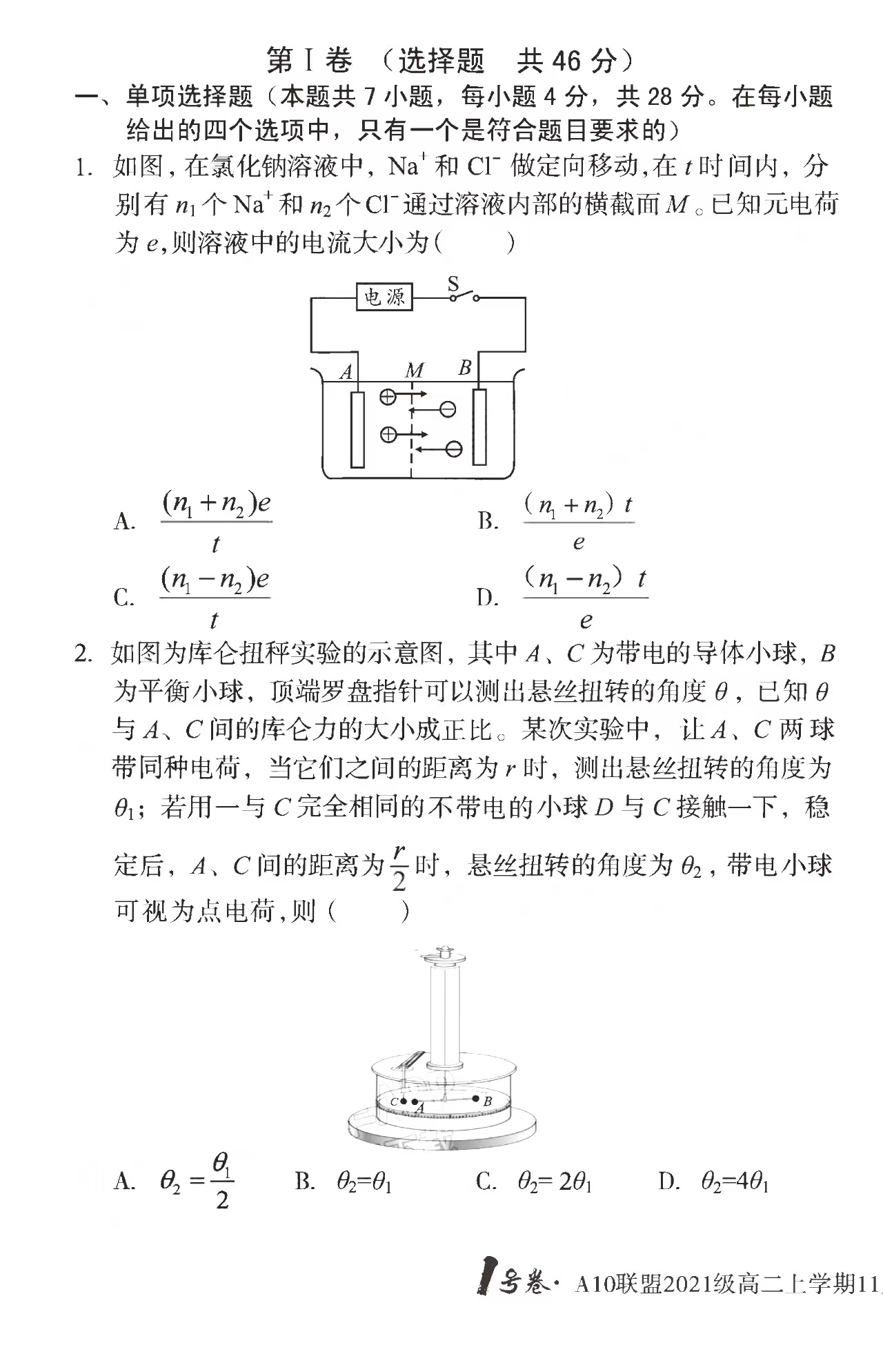 2023安徽A10联盟高二11月联考于2022年11月17日开考,为方便大家下载学习,自主选拔在线团队特整理了2023安徽A10联盟高二11月联考物理试题,供大家参考!