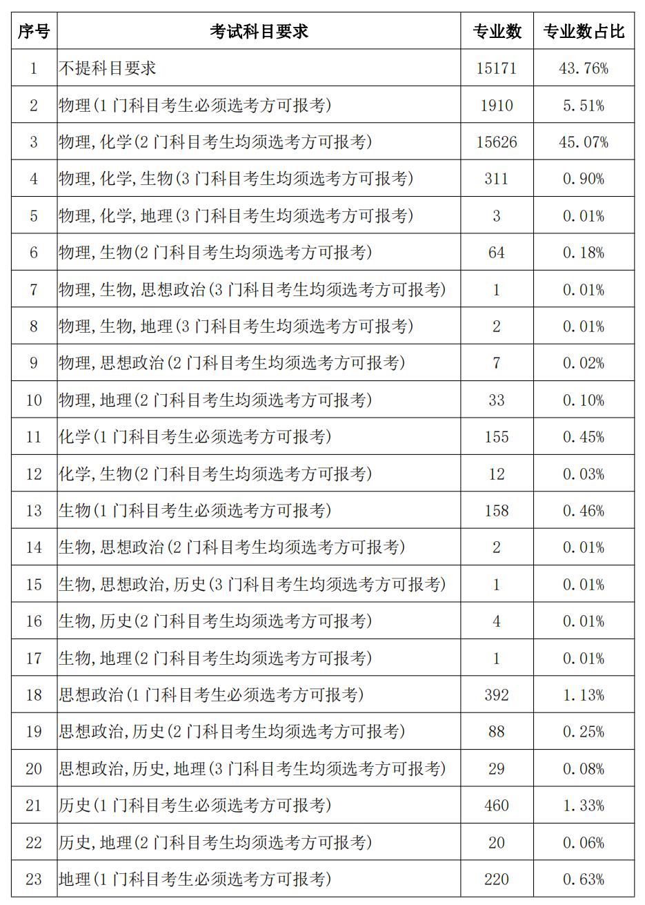 按照目前公布的方案统计,专业选考科目要求共有 23 种,其中不提科目要求的本科专业数量占本科专业总数的 43.76%,