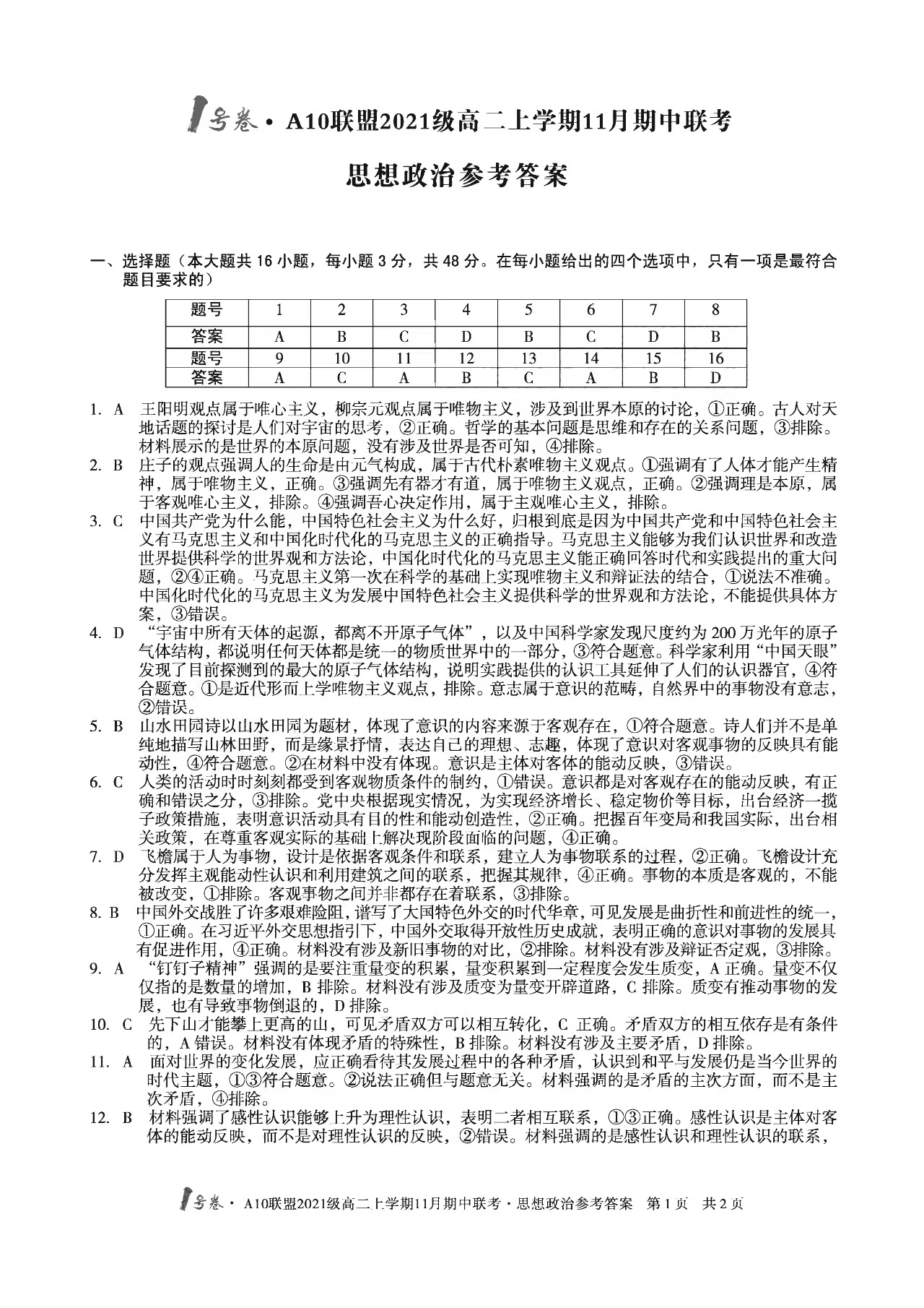 2023安徽A10联盟高二11月联考思想政治试题答案