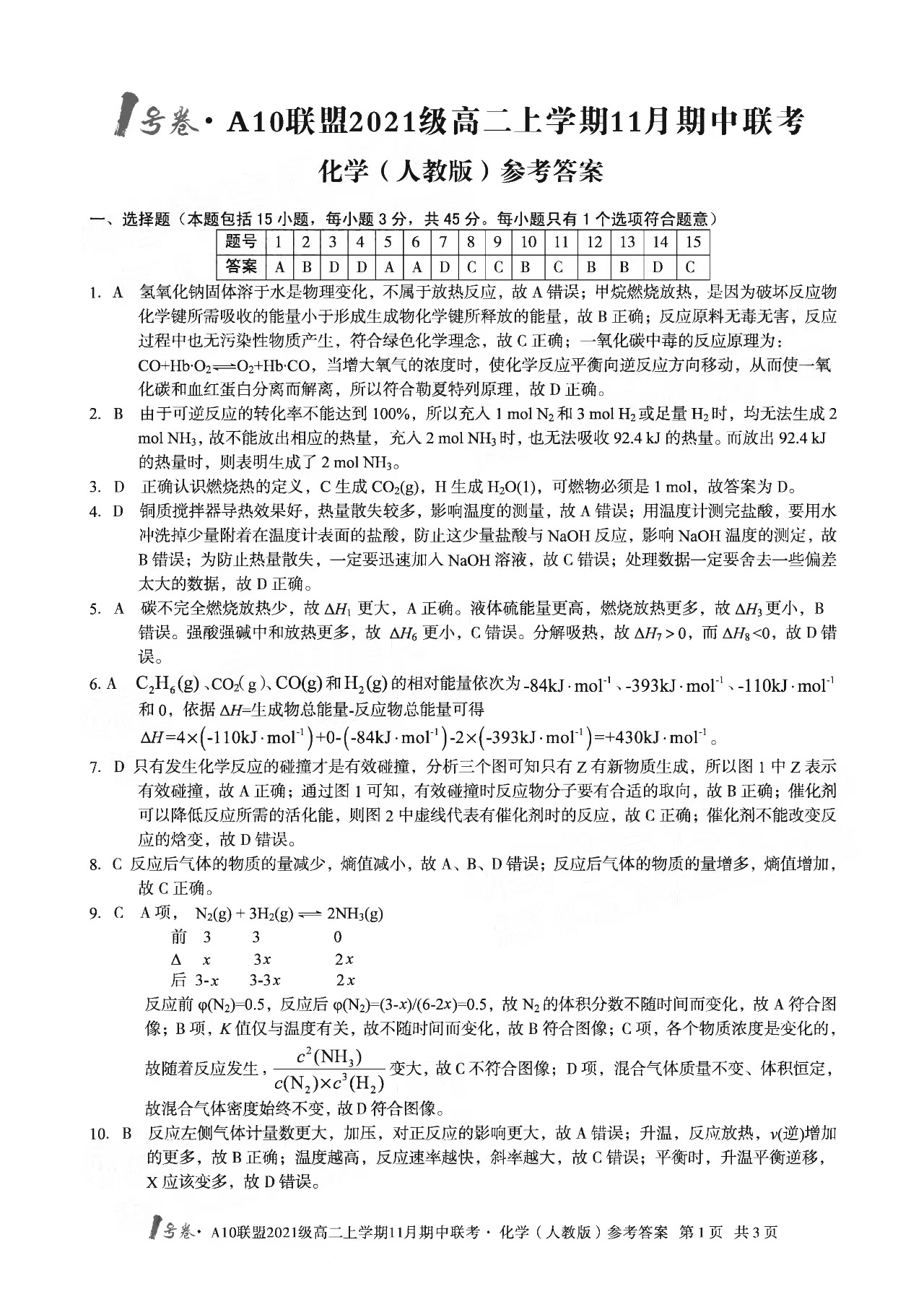 2023安徽A10联盟高二11月联考化学试题答案