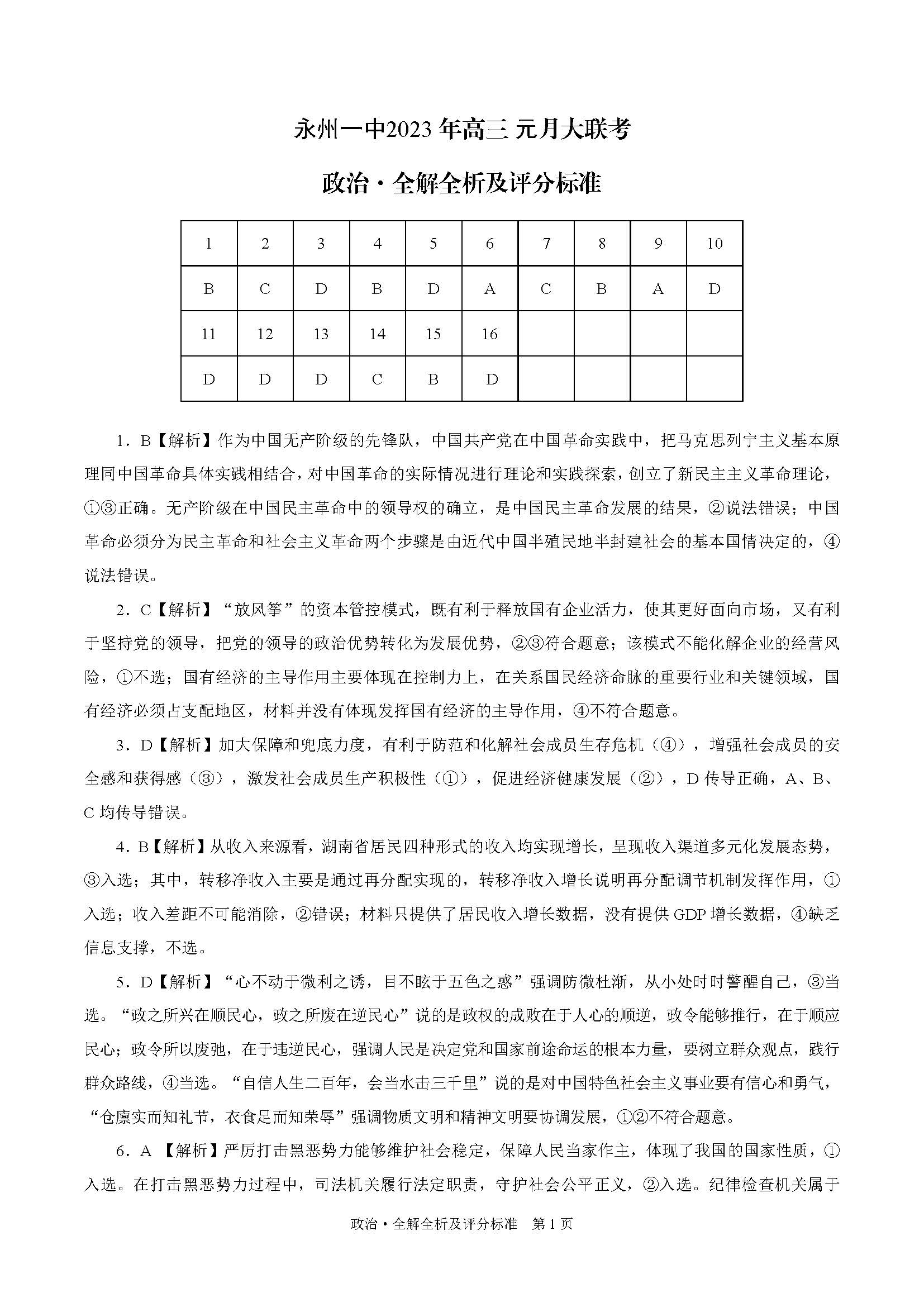 立即下载:湖南省永州市第一中学2023届高三上学期元月考试政治答案