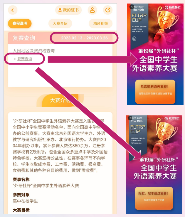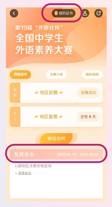 2023年2月13日至3月26日期间,可在赛程中点击“复赛查询”,查看自己是否 通过复赛。