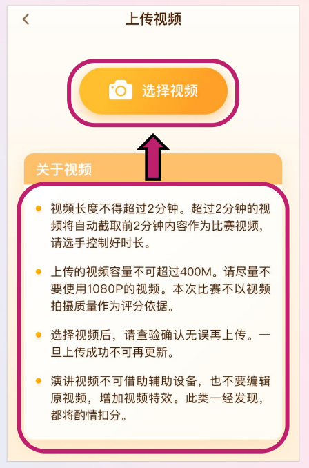 进入测试后,请务必先仔细阅读上传视频的要求,再点“选择视频”按钮,即可从手机相册中,选择并上传自己提前录制好的演讲视频。