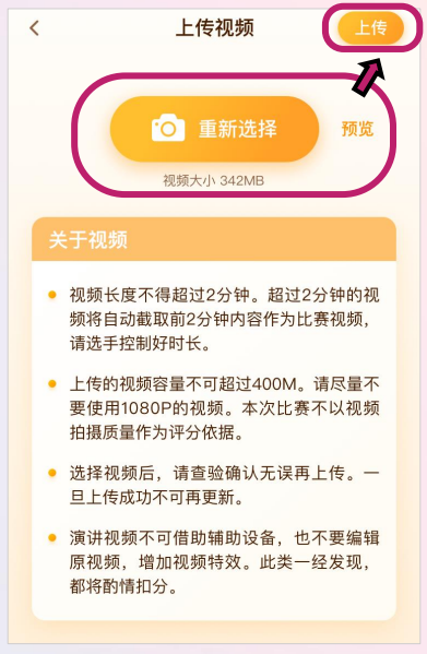 选择好视频后,可查看视频容量、预览视频或重新选择视频。确认无误之后,可点击右上方 的“上传”视频。
