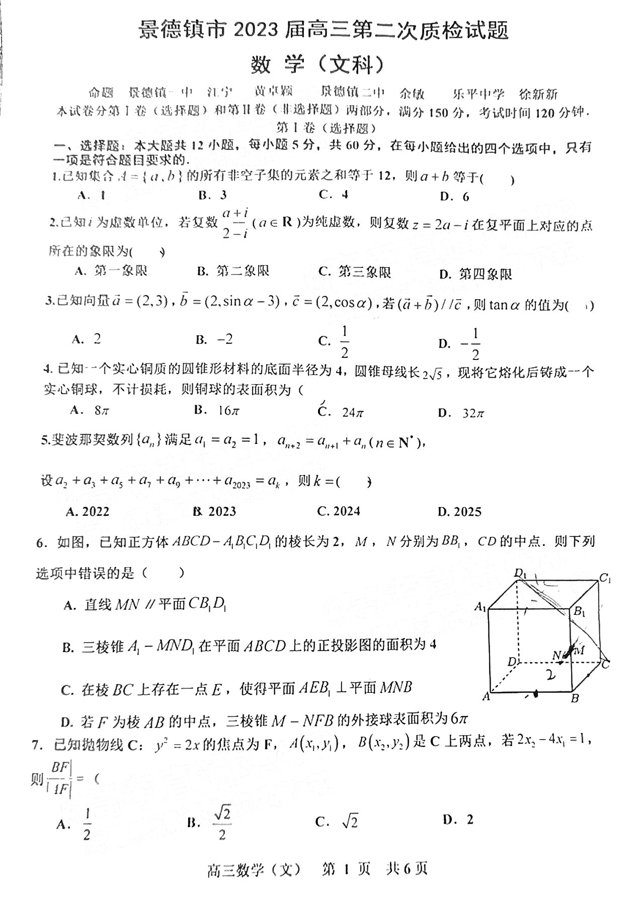 立即下载:江西省景德镇市2023届高三第二次质量检测文科数学试题
