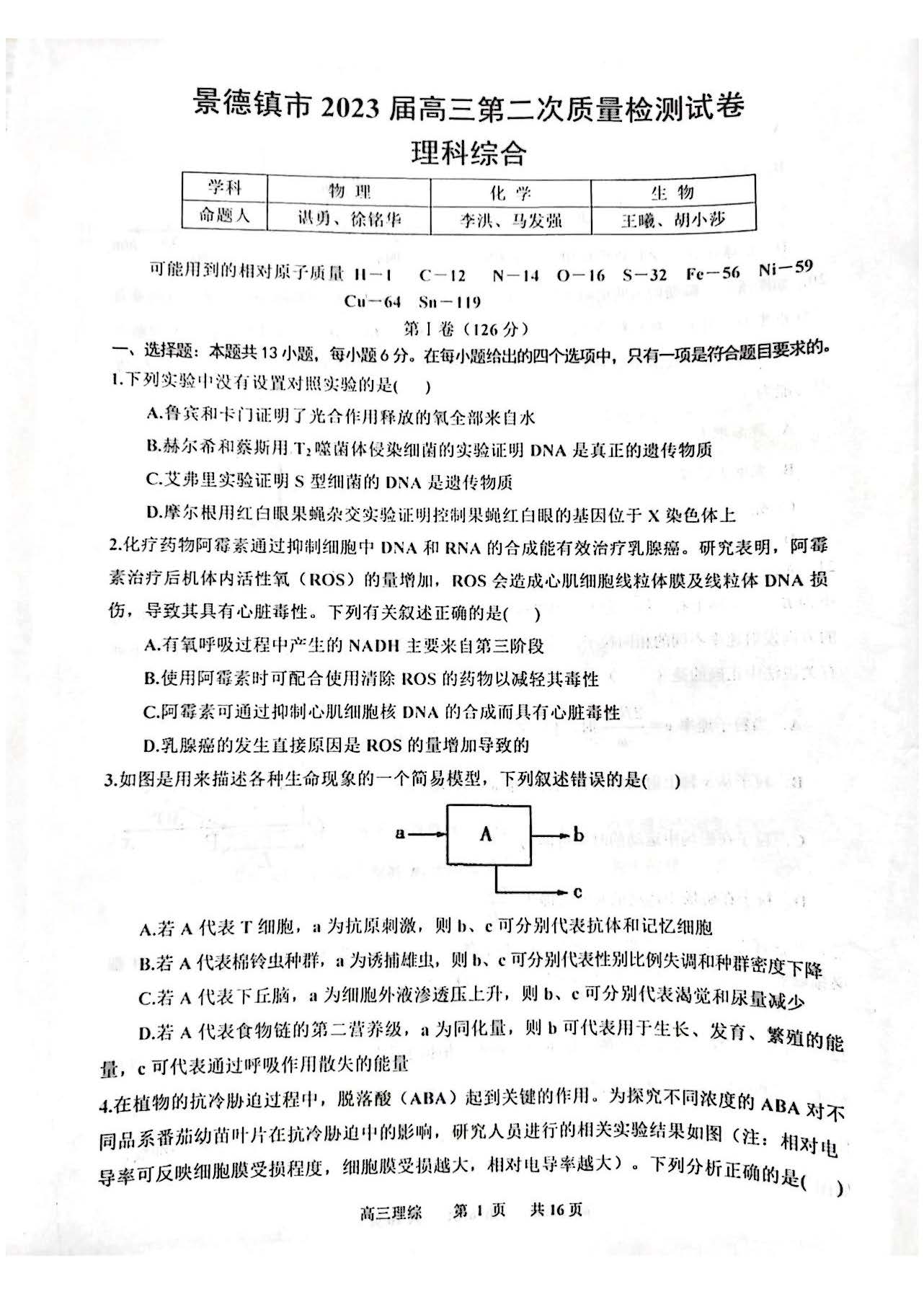 江西省景德镇市2023届高三第二次质量检测理科综合试题