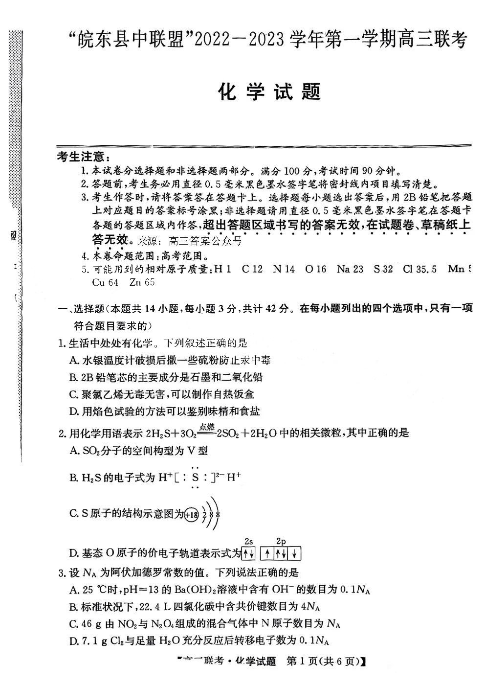 安徽省皖东县中联盟2023届高三1月联考化学试题