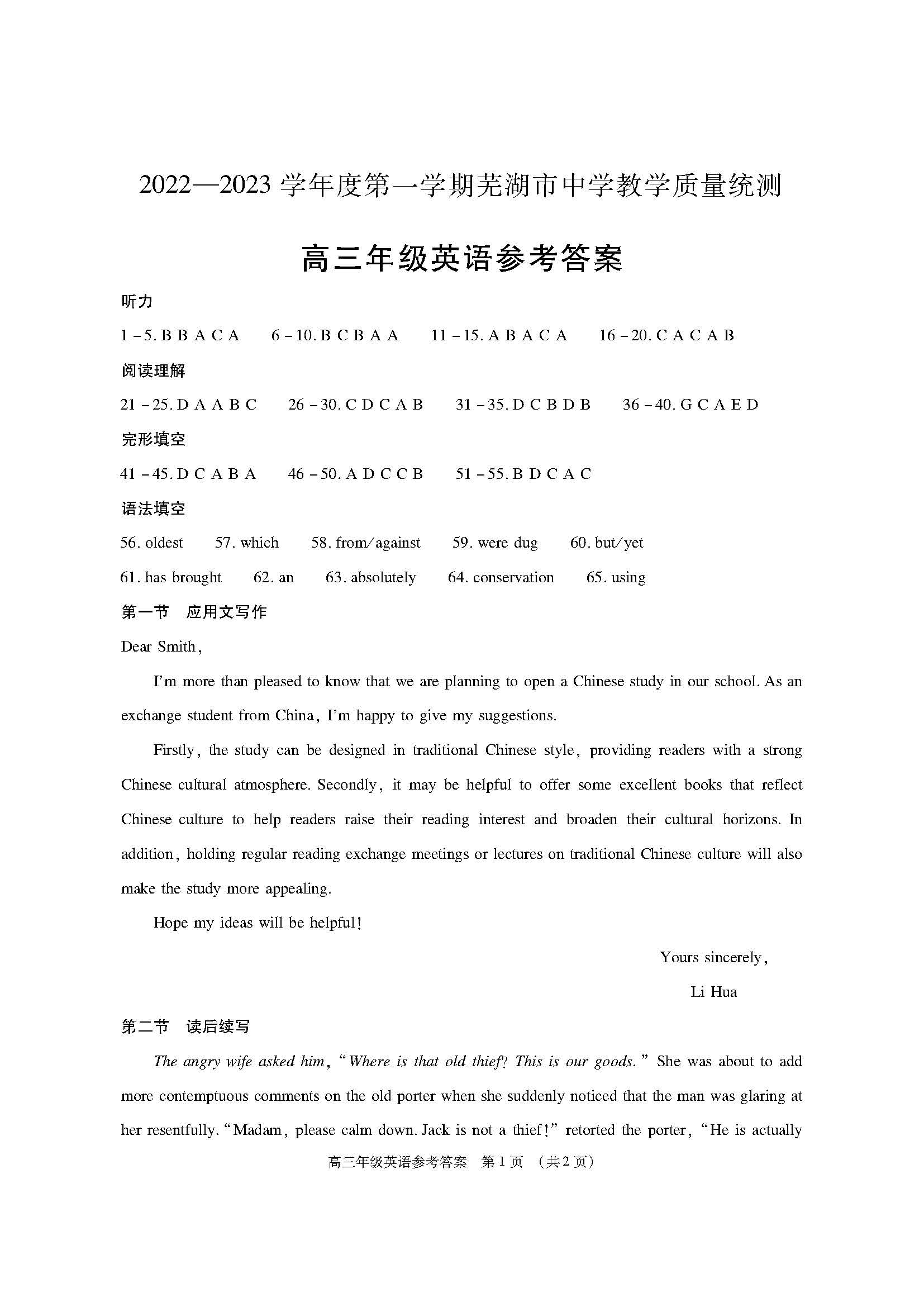 立即下载:安徽省芜湖市2023届高三上学期期末教学质量统测英语答案