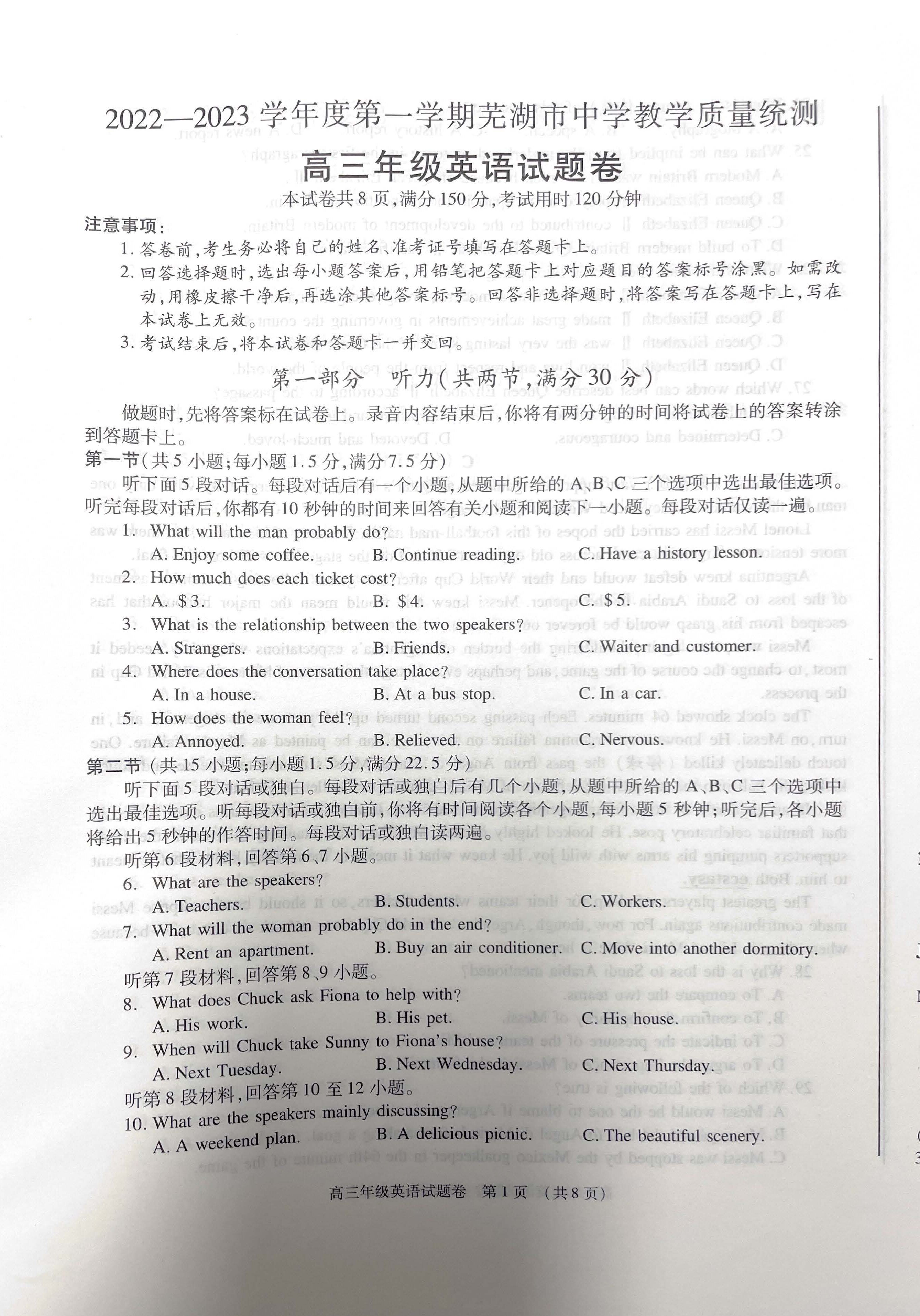 安徽省芜湖市2023届高三上学期期末教学质量统测英语试题