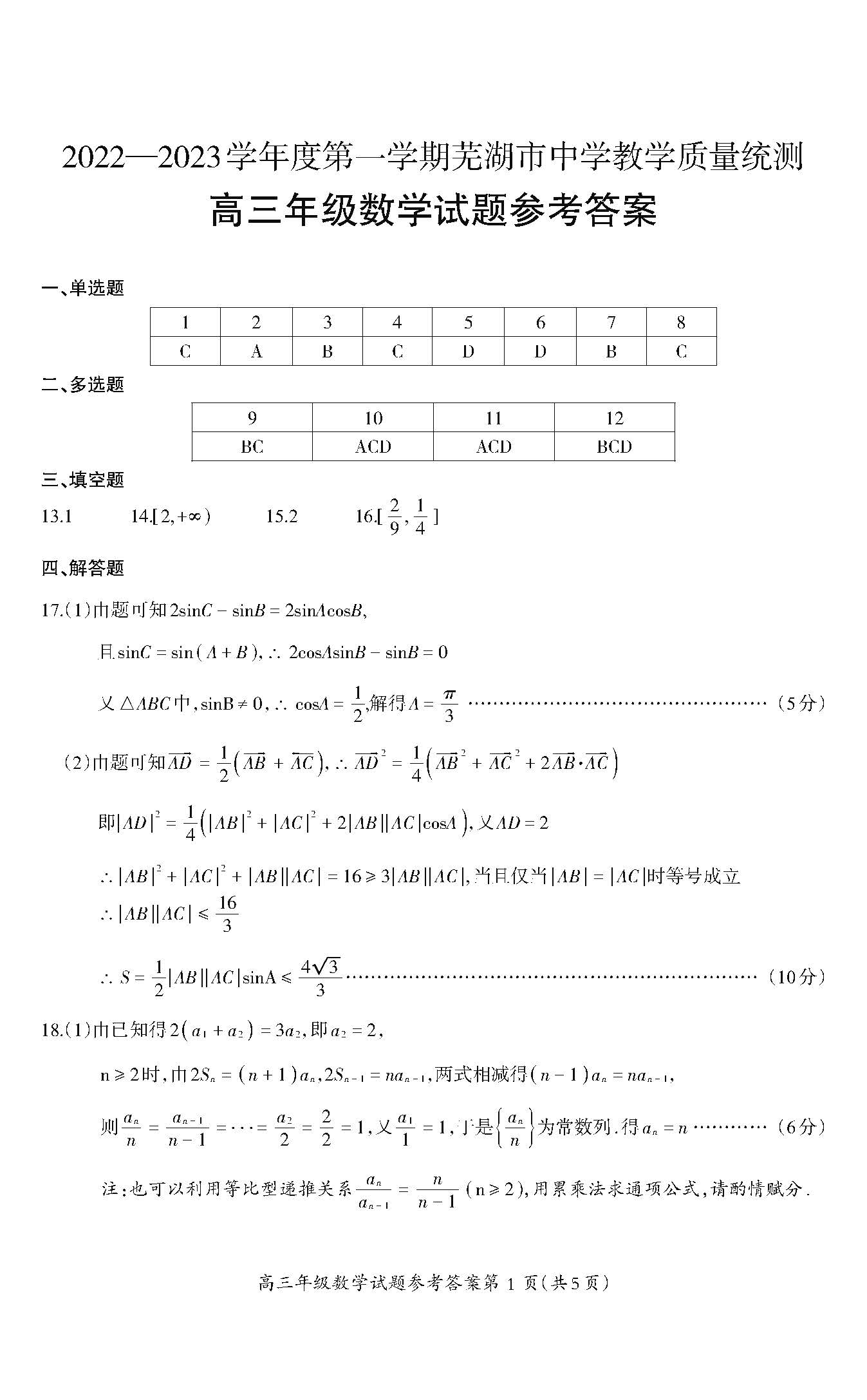安徽省芜湖市2023届高三上学期期末教学质量统测数学答案