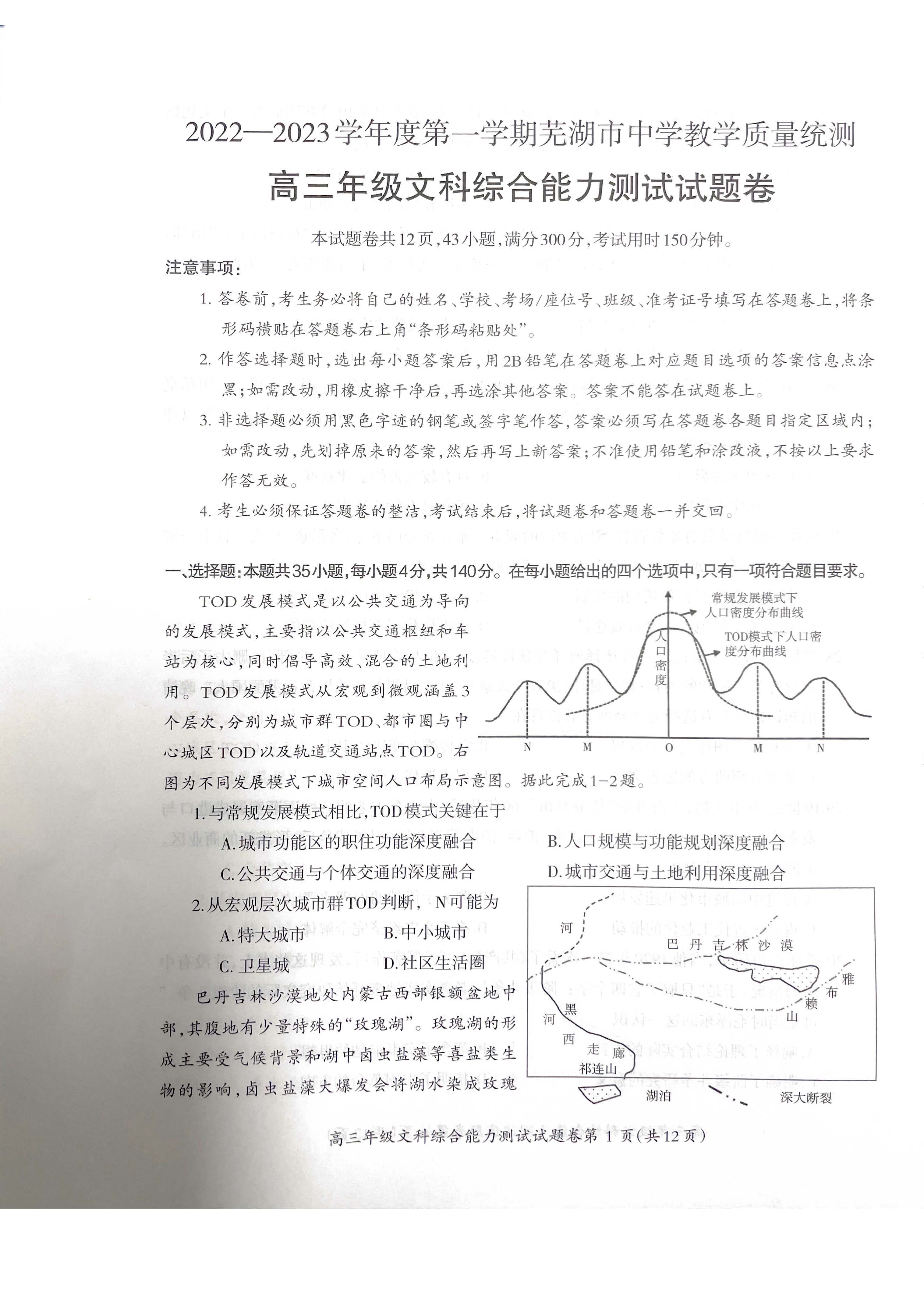 安徽省芜湖市2023届高三上学期期末教学质量统测文科综合试题