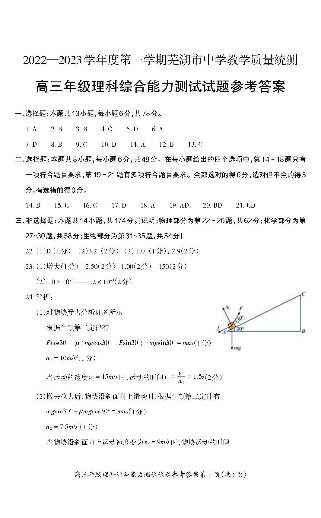 安徽省芜湖市2023届高三上学期期末教学质量统测理和综合答案