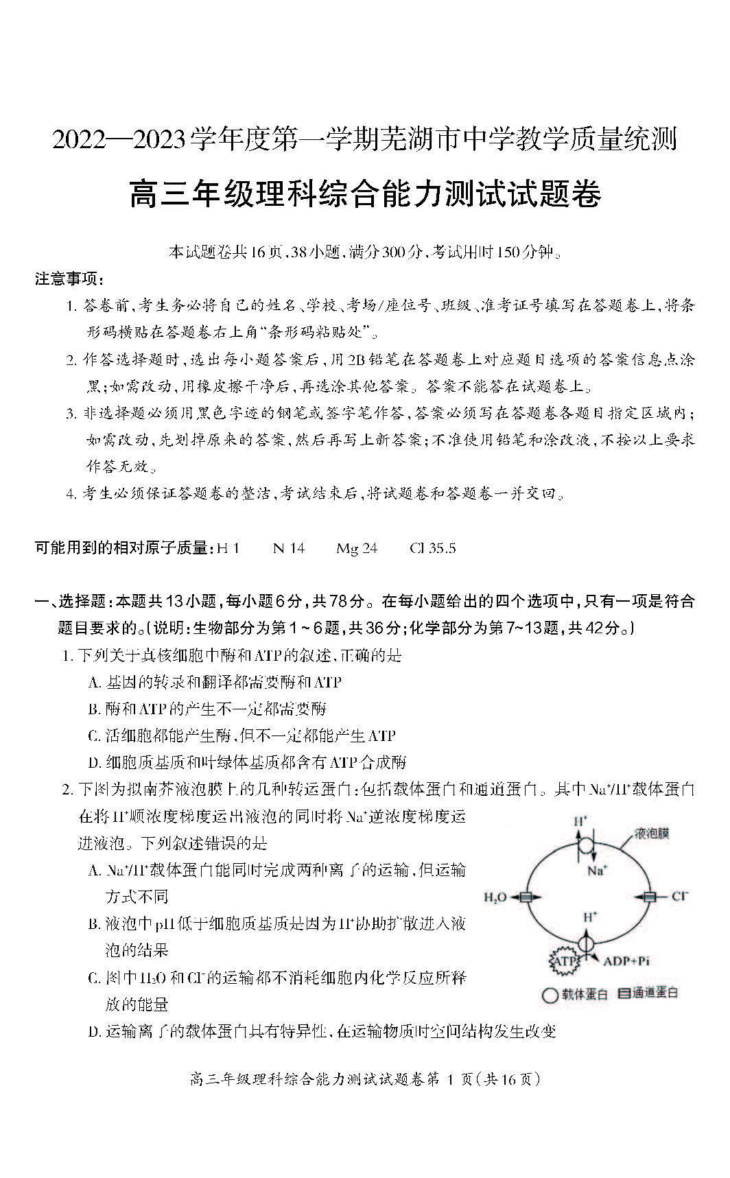 安徽省芜湖市2023届高三上学期期末教学质量统测理科综合试题