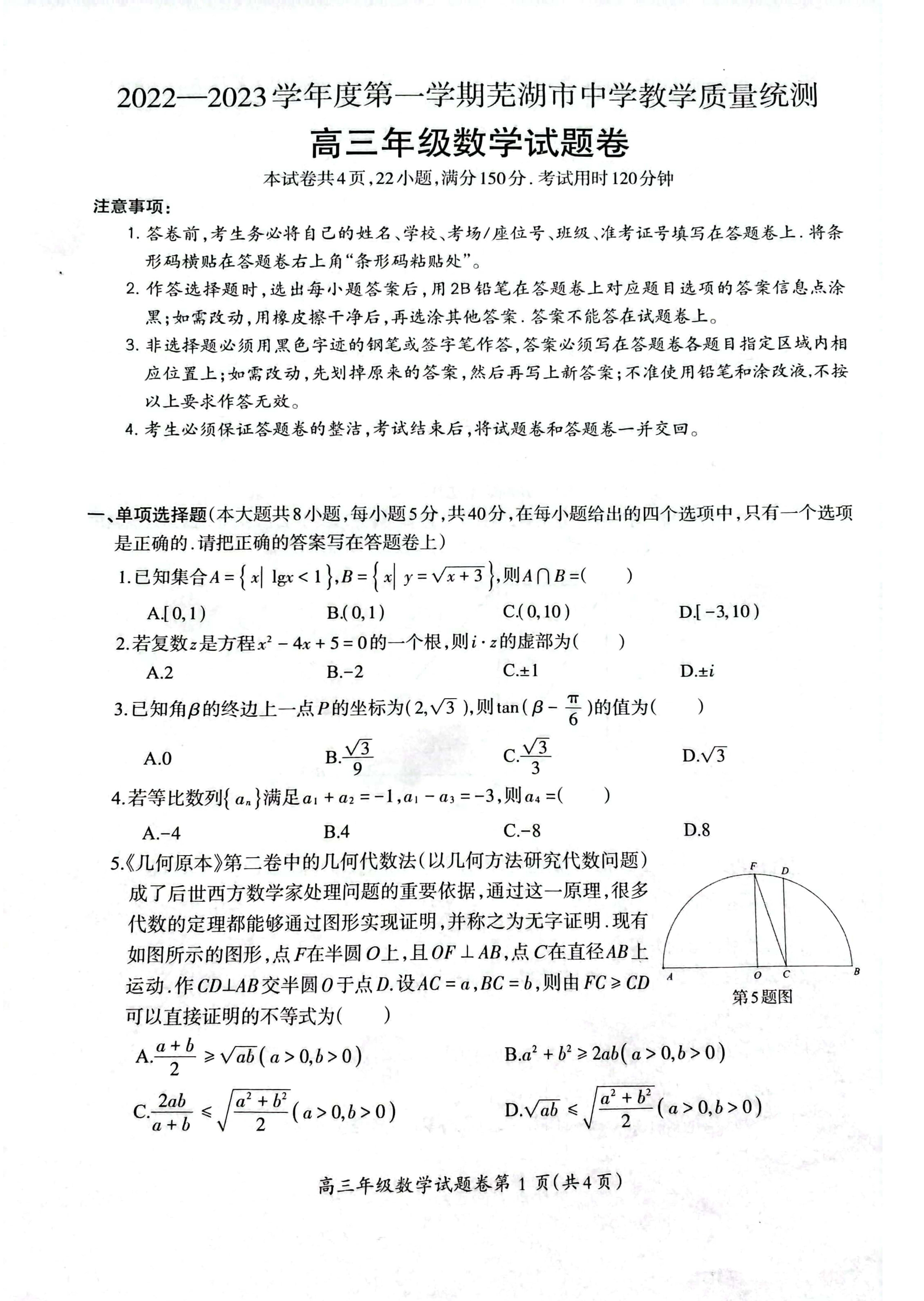 安徽省芜湖市2023届高三上学期期末教学质量统测数学试题