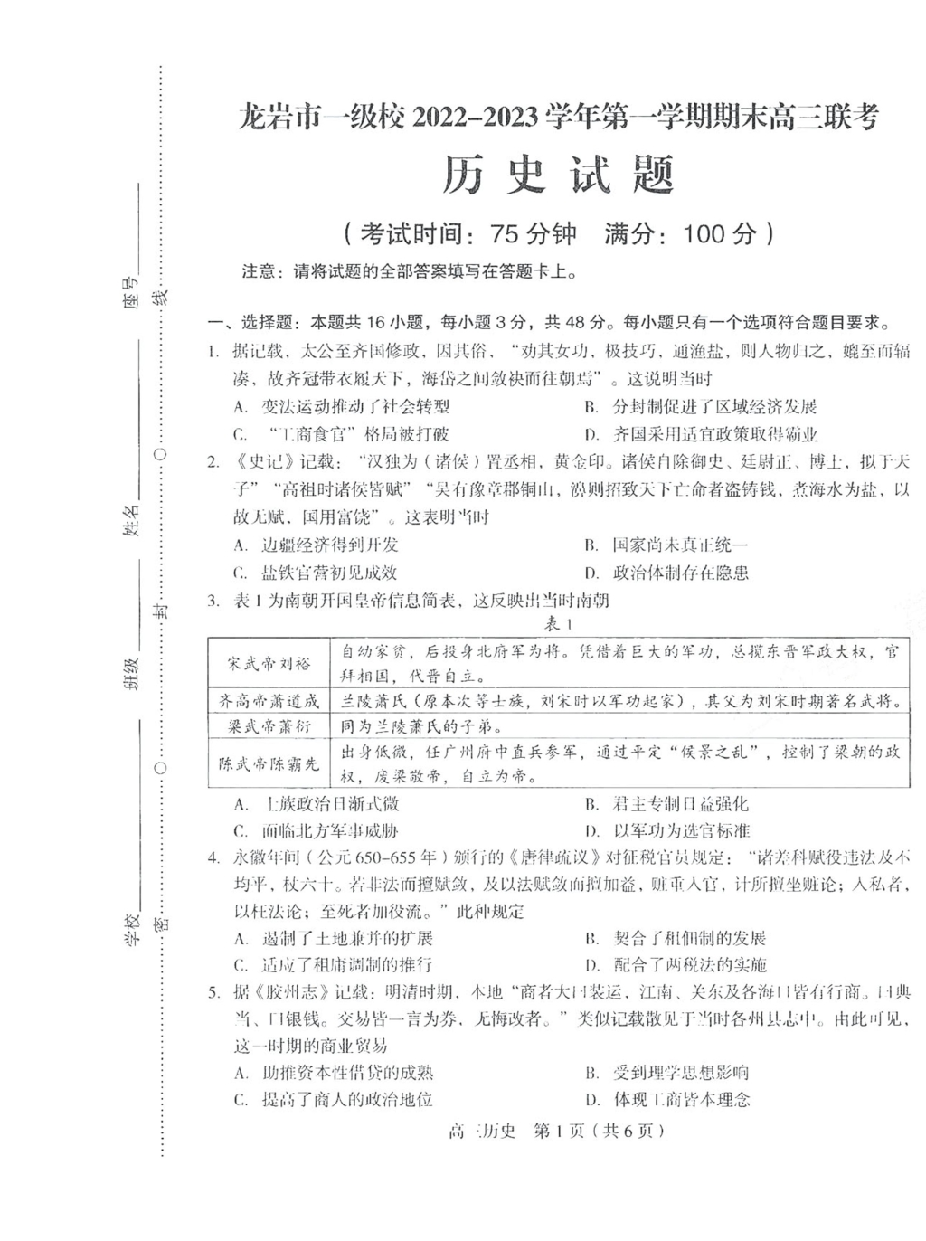 福建省龙岩市2023届高三上学期1月期末历史试题