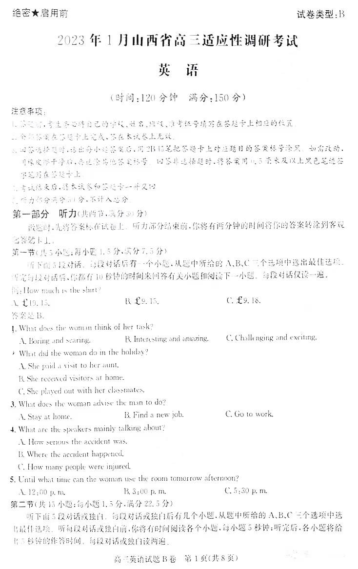 2023山西省高三1月期末调研测试于2023年1月30日开考,为方便大家下载学习,自主选拔在线团队特整理了2023山西省高三1月期末调研测试英语试题,供大家参考!