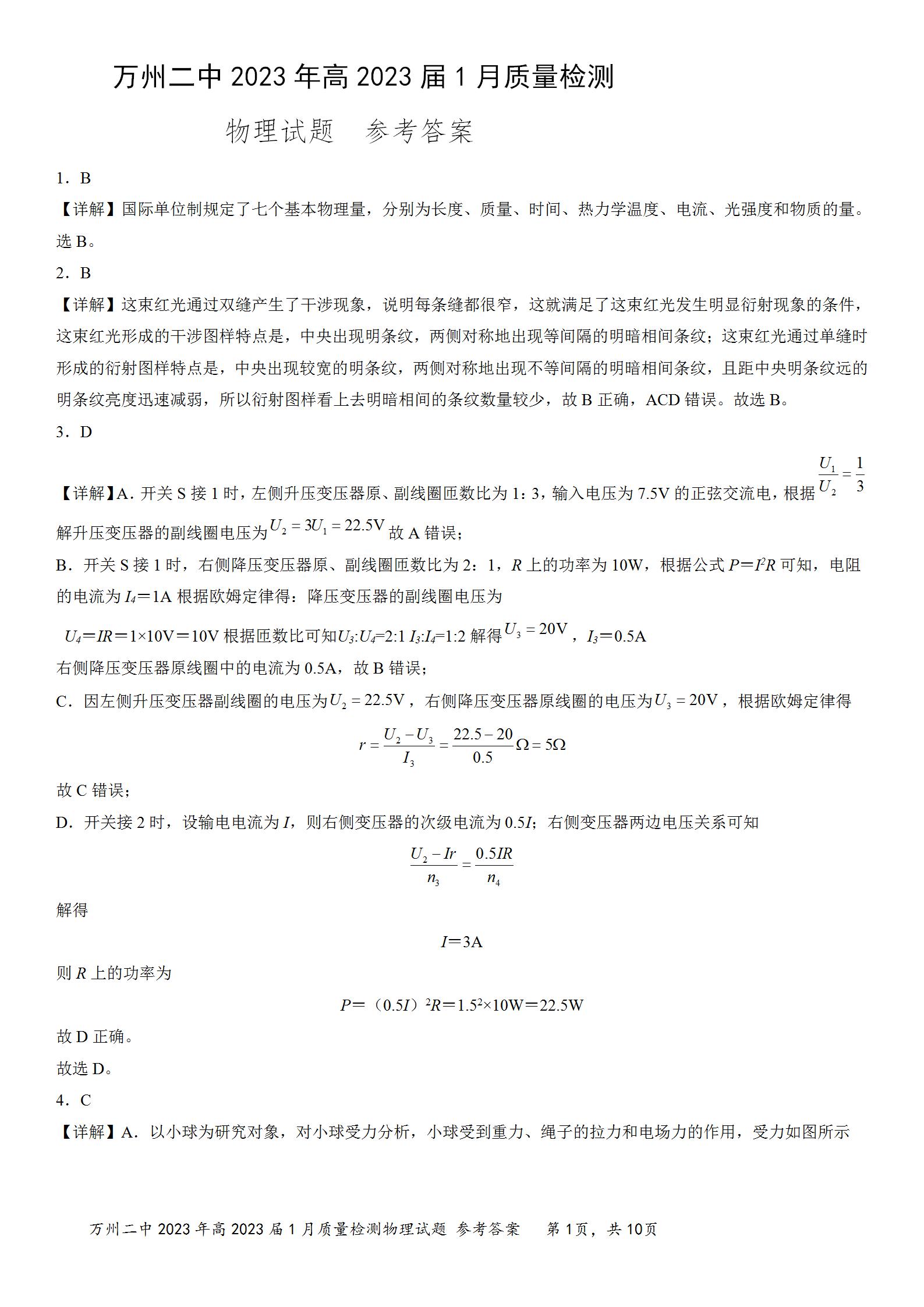 重庆市万州第二高级中学2023届高三上学期1月质量检测物理答案