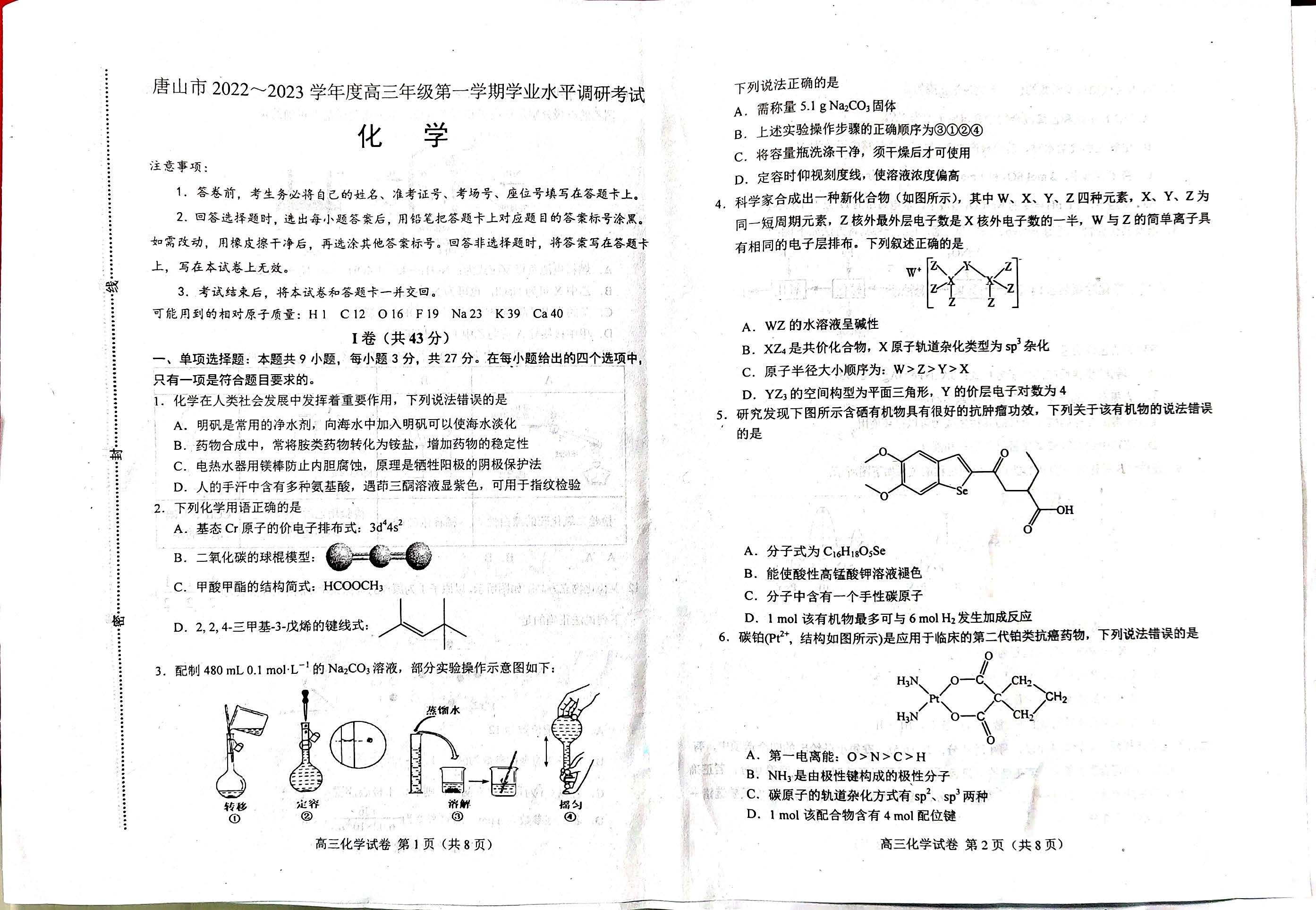 河北唐山市2023届高三第一学期期末化学试题