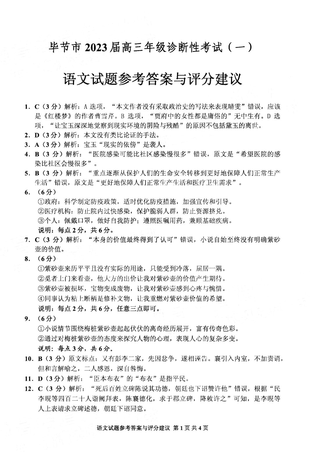 贵州市毕节市2023届高三一诊试题及答案汇总2023-02-09