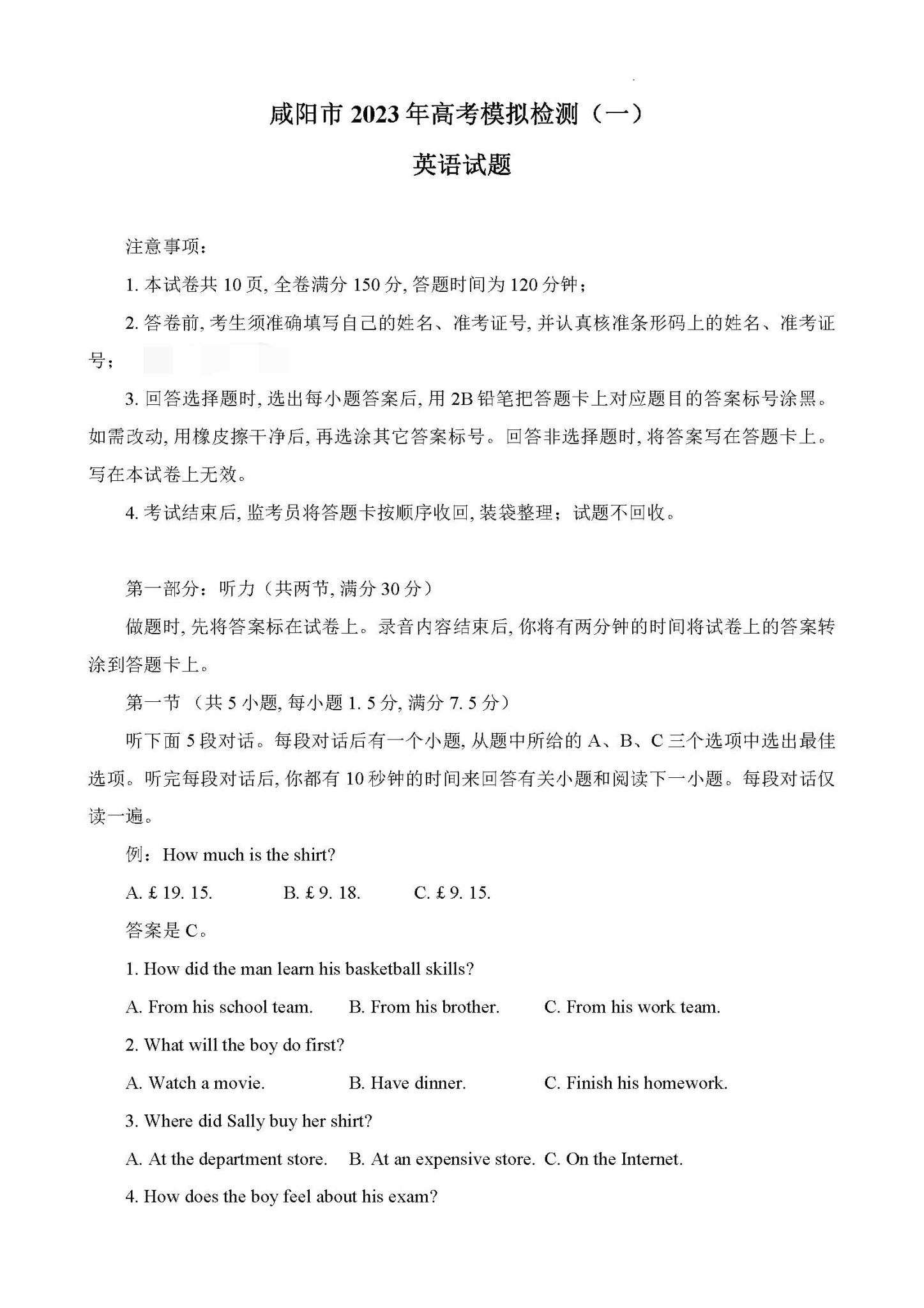 陕西省咸阳市2023届高三高考模拟检测一英语试题