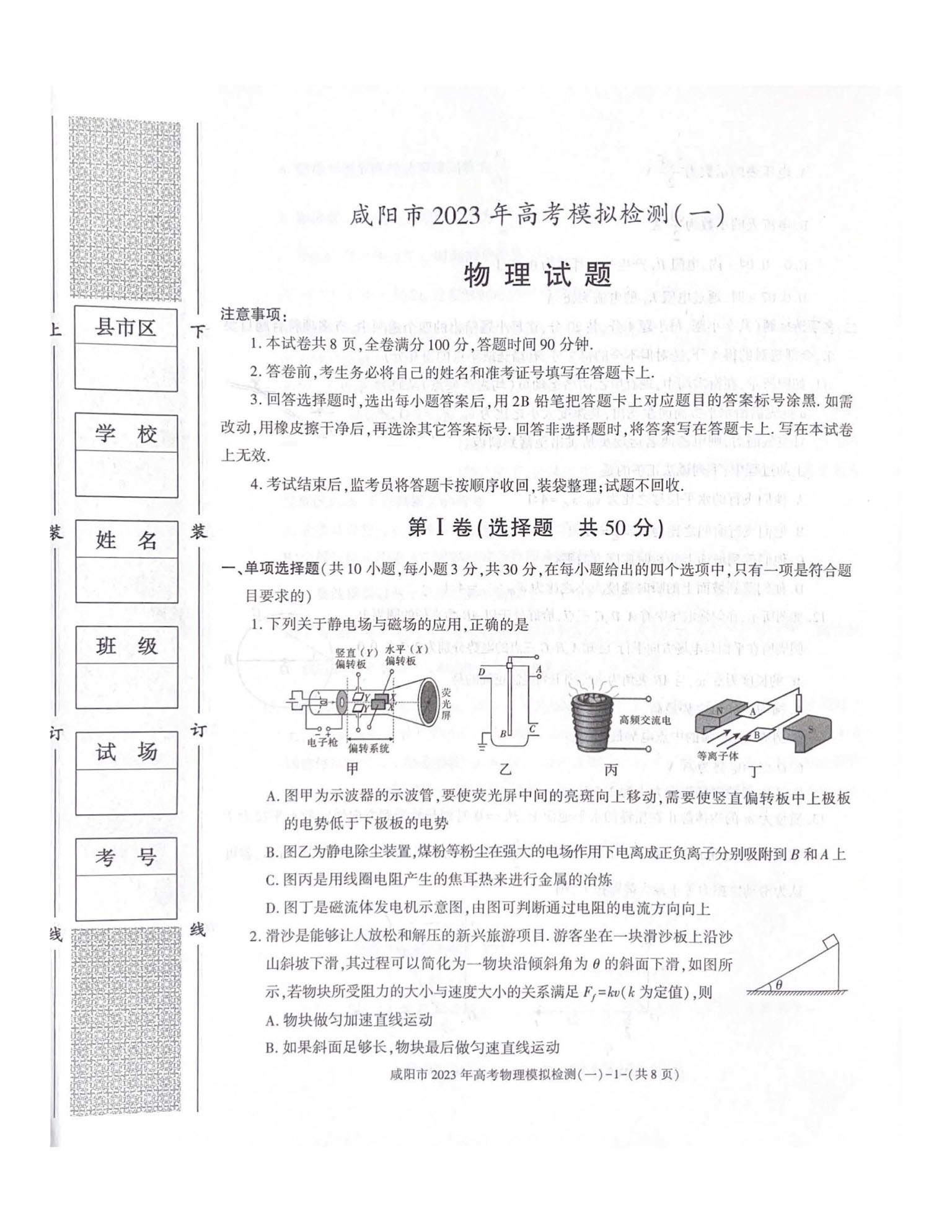 陕西省咸阳市2023届高三高考模拟检测一物理试题