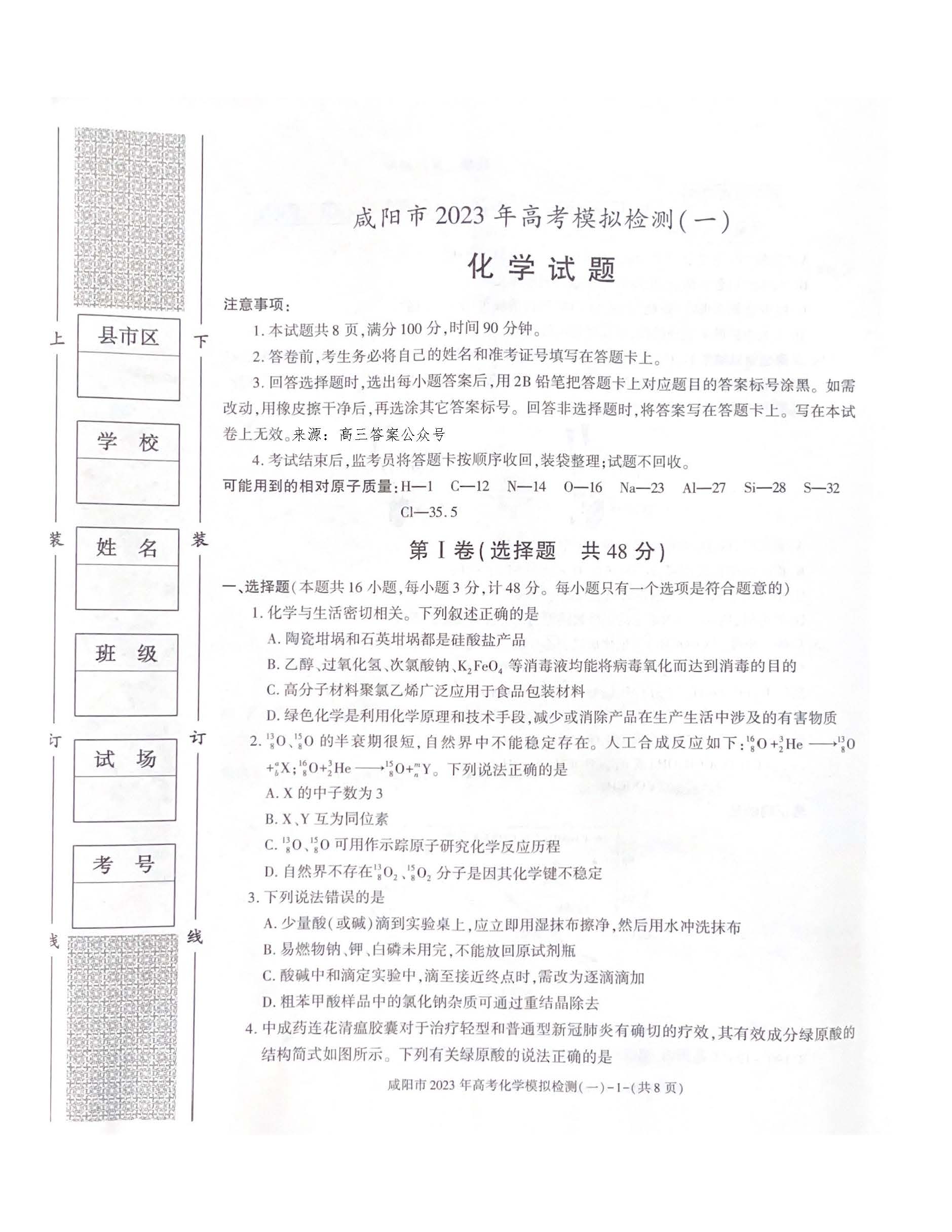 陕西省咸阳市2023届高三高考模拟检测一化学试题