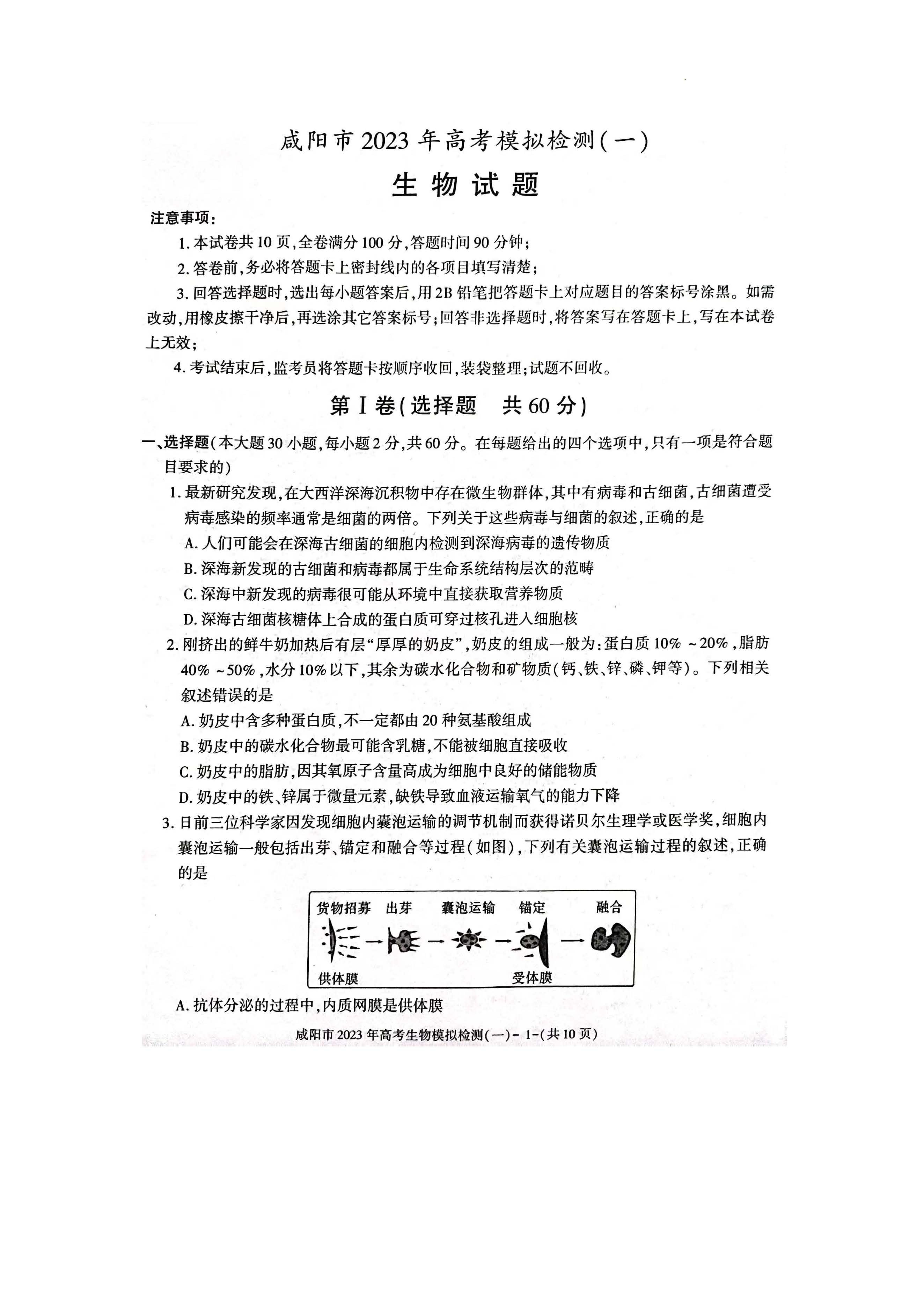 陕西省咸阳市2023届高三高考模拟检测一生物试题