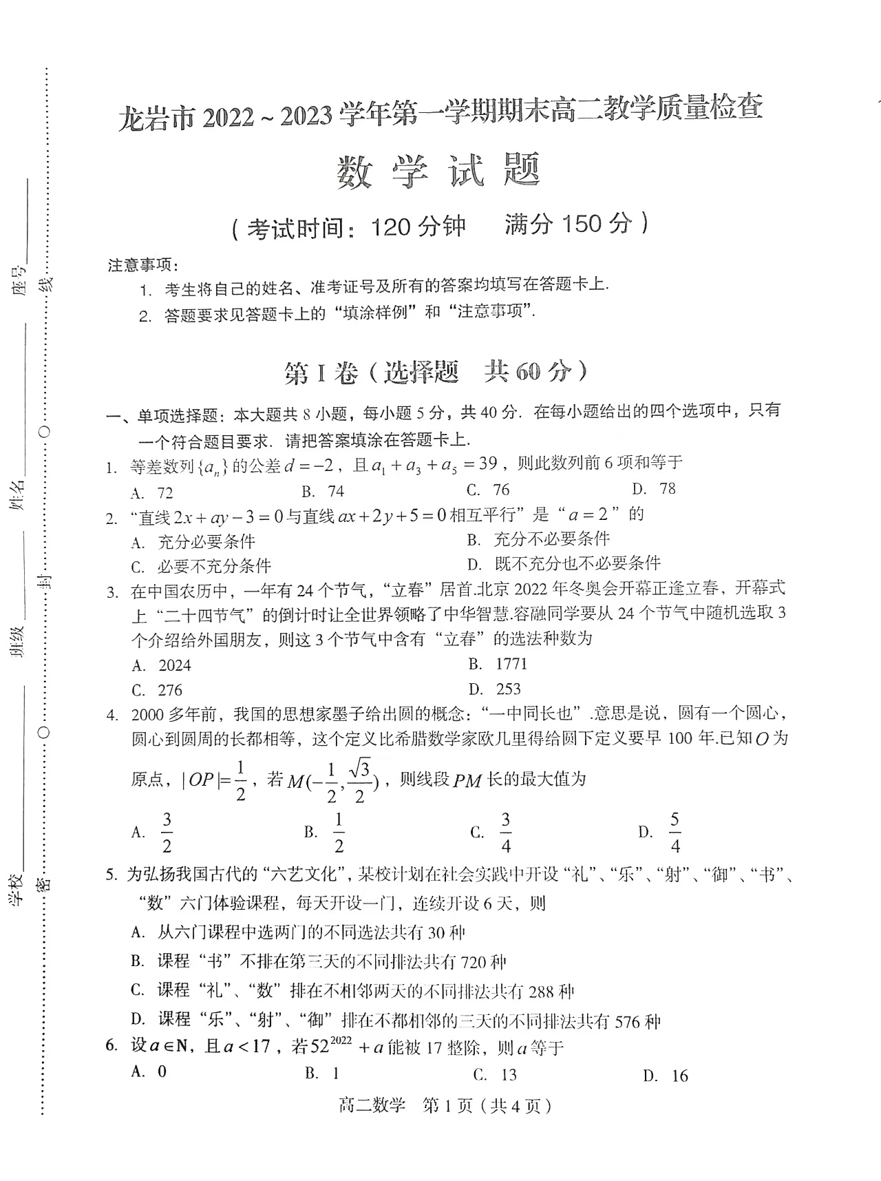 2023福建龙岩高二上学期期末考试于2023年2月13日开考,为方便大家下载学习,自主选拔在线团队特整理了2023福建龙岩高二上学期期末考试数学试题,供大家参考!