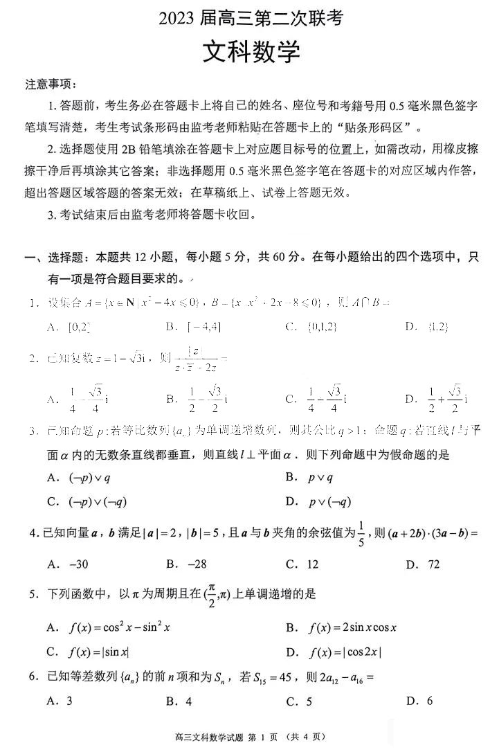 蓉城名校联盟2023届高三第二次联考文科数学试题