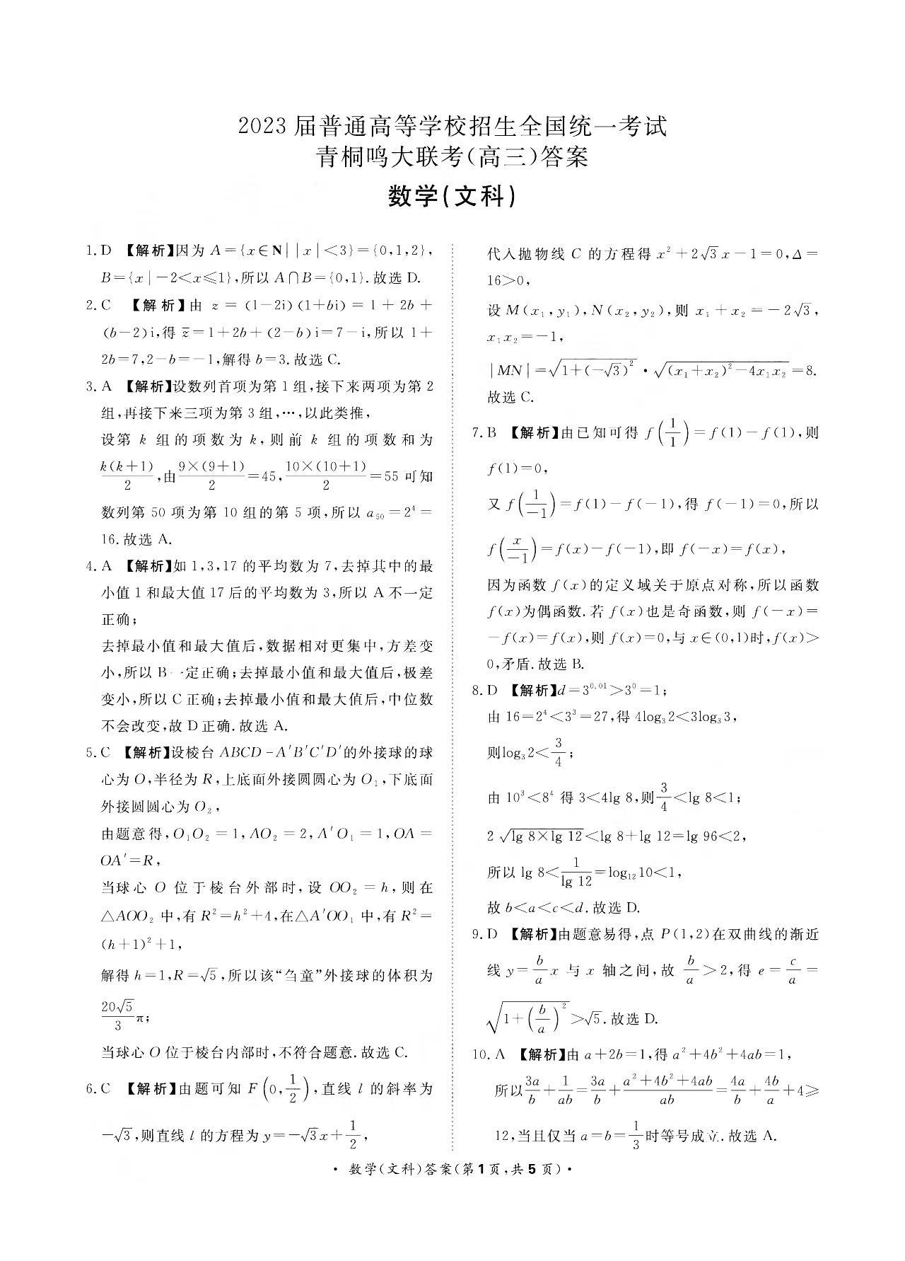 2023河南青桐鸣高三2月联考于2月23日正式开考,为方便大家巩固练习,自主选拔在线团队特此汇总整理了2023河南青桐鸣高三2月联考文数试题答案,供大家下载。