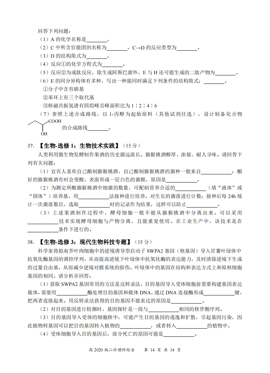 2023年南充高三适应性考试(二诊)试题及答案汇总