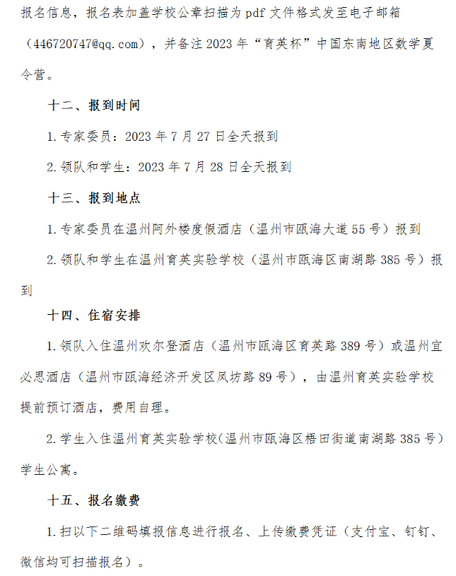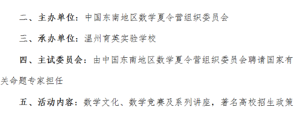 2023年中国东南地区数学夏令营将于7月28日-8月2日在温州育英实验学校举行,有意参加活动的学校可在7月10日前报名。