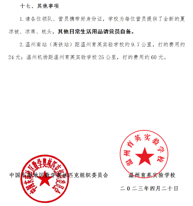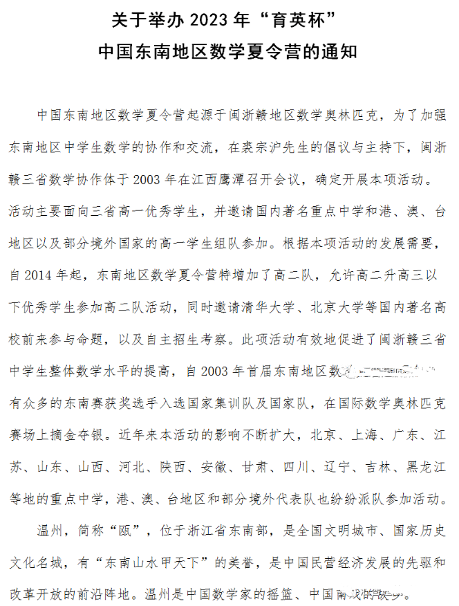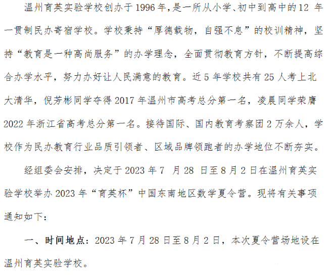 近日,官方发布《关于举办2023年“育英杯”中国东南地区数学夏令营的通知》。2023年中国东南地区数学夏令营将于7月28日-8月2日在温州育英实验学校举行,有意参加活动的学校可在7月10日前报名。