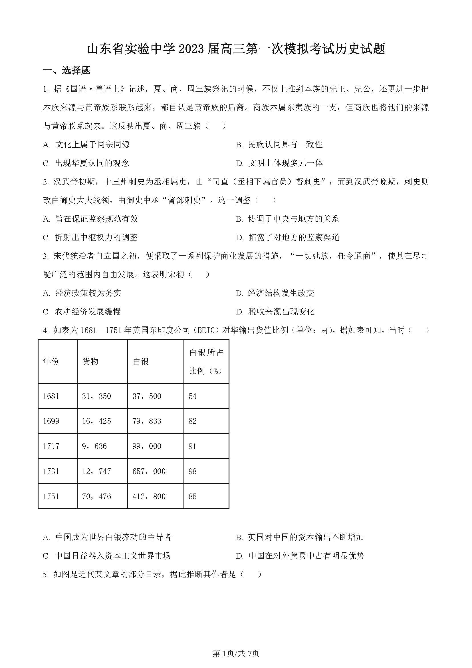 山东省实验中学2023届高三第一次模拟考试历史试题