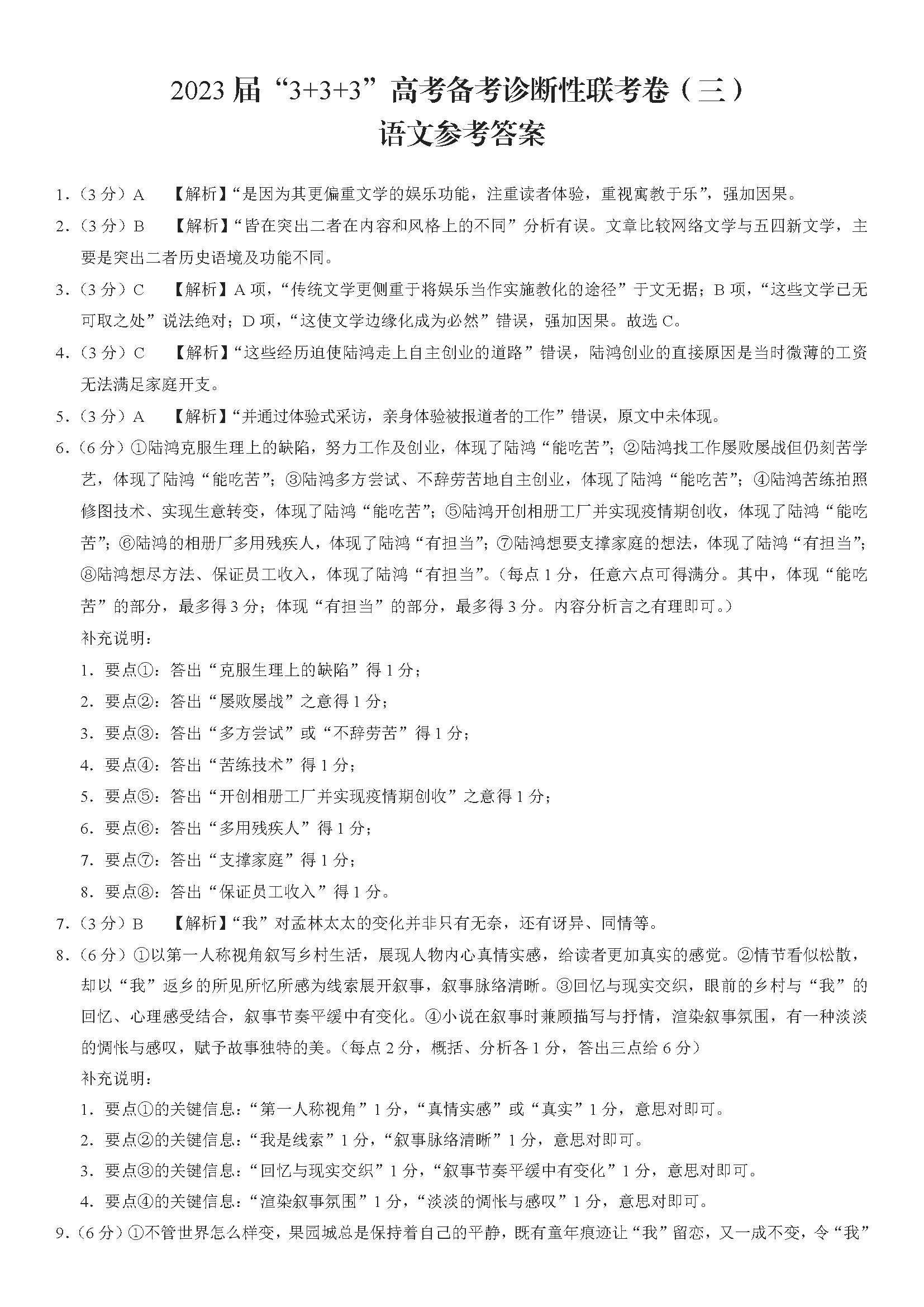 2023届贵州省贵阳市3+3+3高考备考诊断性联考(三)语文答案