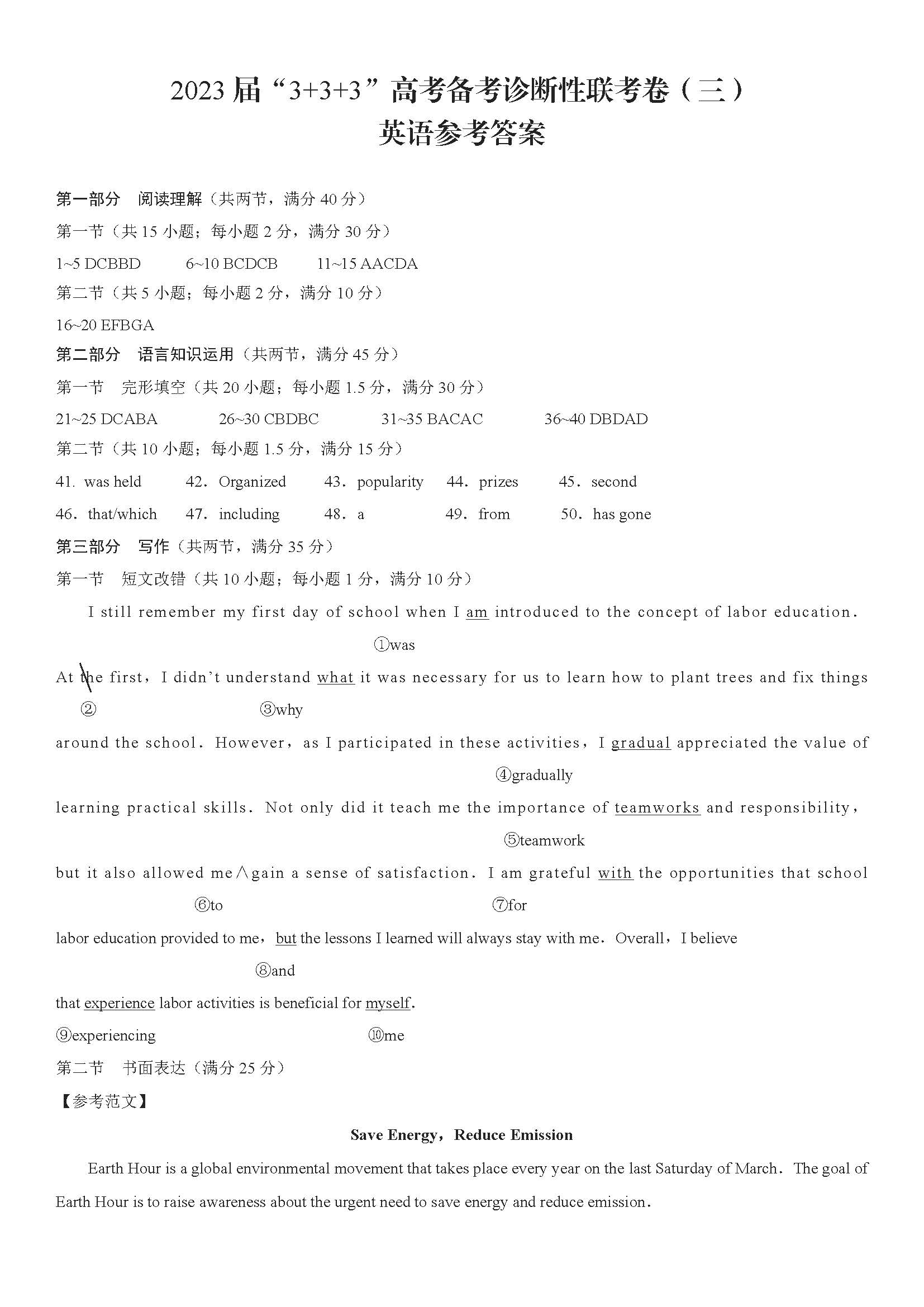 2023届贵州省贵阳市3+3+3高考备考诊断性联考(三)英语答案