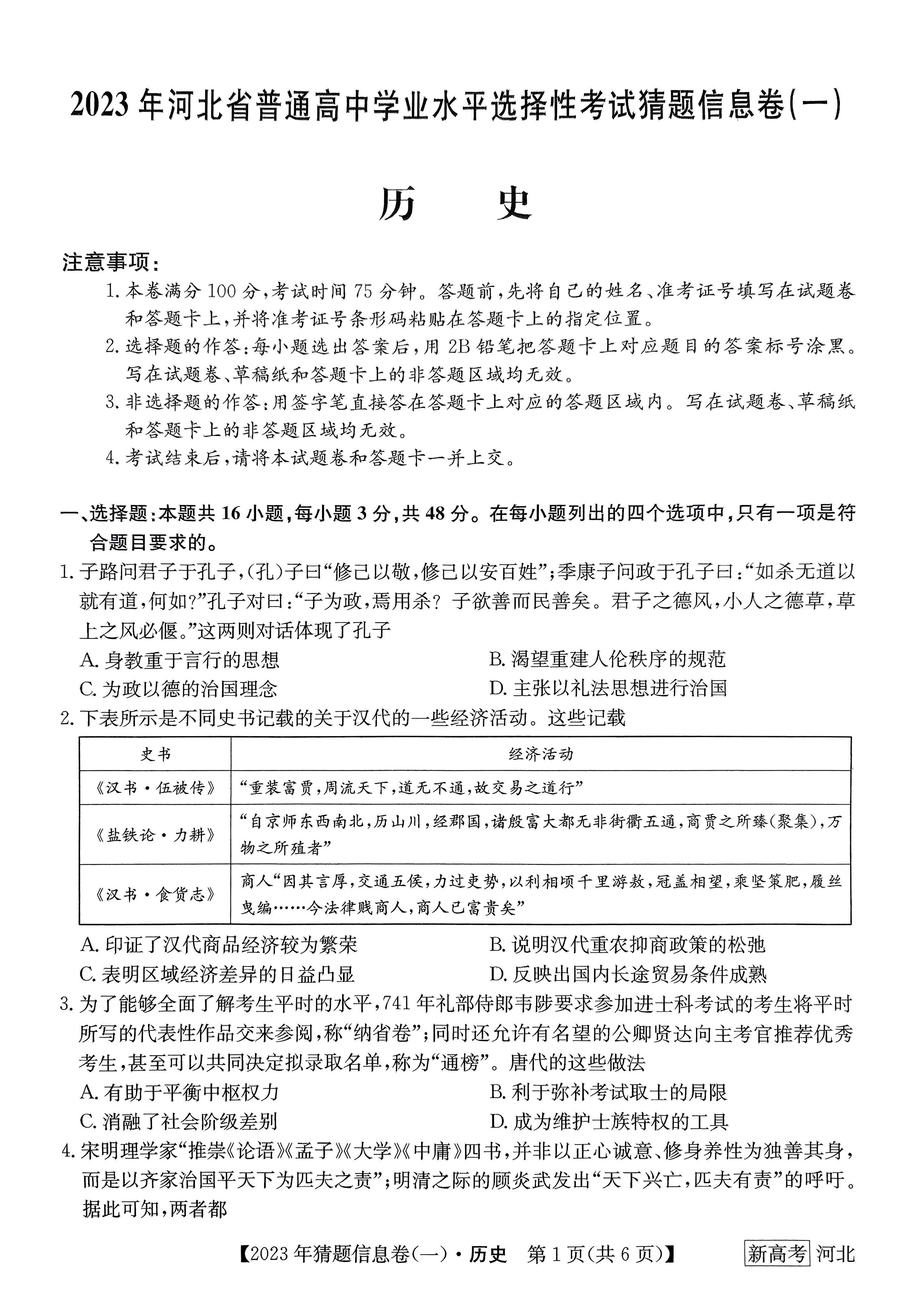 河北省2023年高考猜题信息卷(一)历史试题