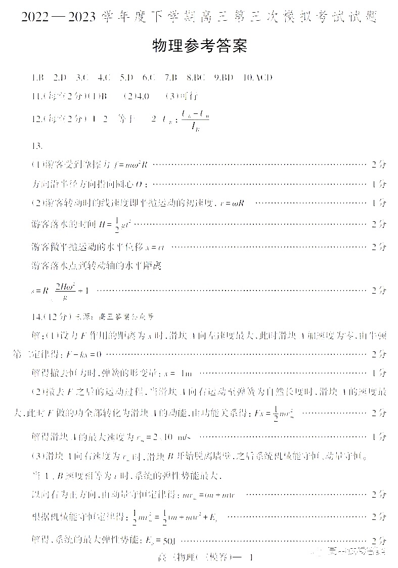 辽宁2022-2023学年下学期高三第三次模拟考试于近日开考,为方便大家下载学习,自主选拔在线团队特整理了辽宁2022-2023学年下学期高三第三次模拟考试物理试题答案,供大家参考!