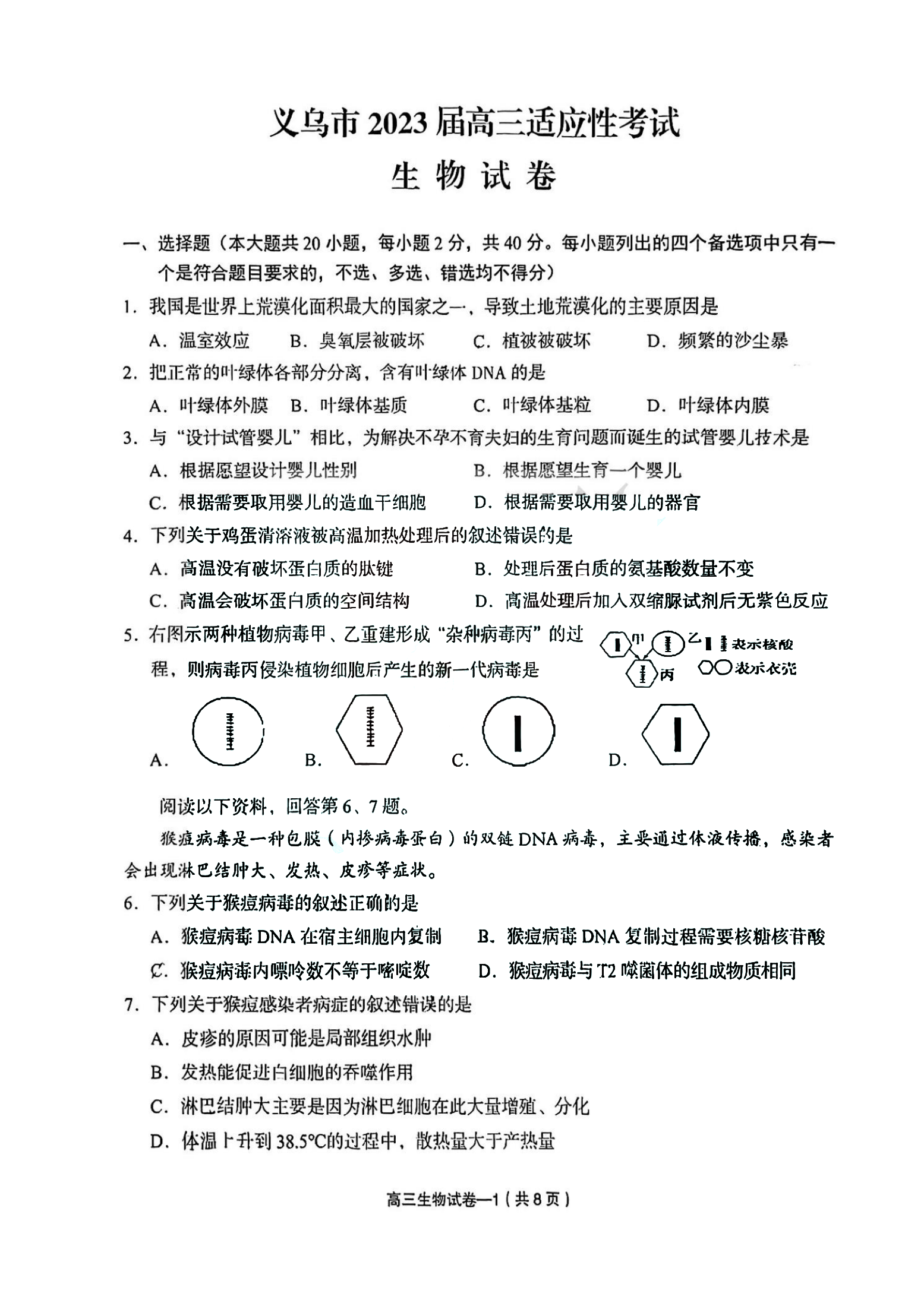 2023浙江省义乌市高三适应性考试于近期开考,为方便大家巩固练习,自主选拔在线浙江新高考团队同步整理了义乌市高三适应性考试生物相关试题及答案,供大家下载。